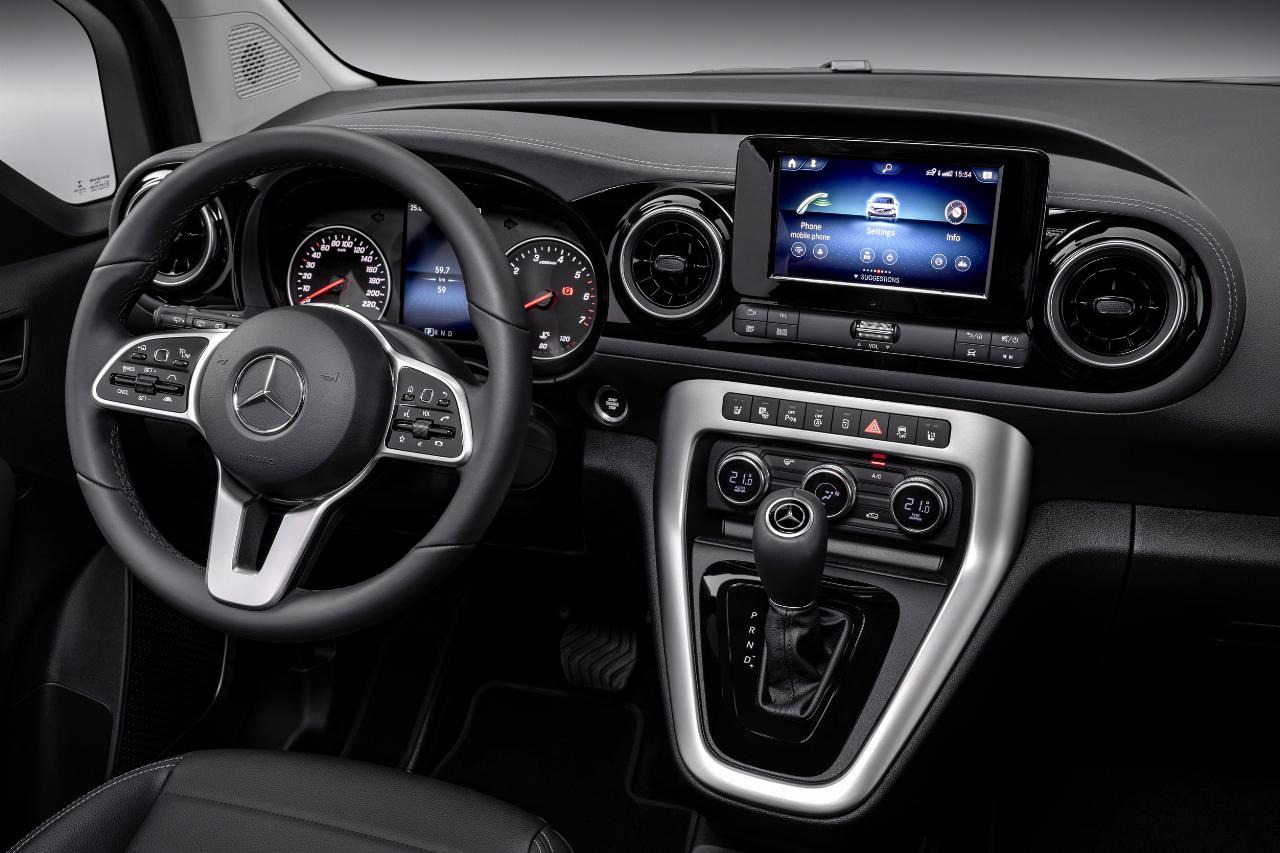Vor allem aber bei Interieur und Ausstattung soll sich die T-Klasse vom internen wie externen Wettbewerb unterscheiden. Und auf den ersten Blick sieht auch alles nach vertrauter Mercedes-Pkw-Optik aus. Allen voran das Multifunktionslenkrad mit den filigranen Wischflächen und Scrolltasten wie es auch A-, B- oder C-Klasse zu finden ist. Dazu die bekannten kreisrunden Lüftungsdüsen, Tasten, Schalter und Drehregler, ein handschmeichlerischer Schalthebelknauf und natürlich das MBUX-Infotainment, das es so aber auch schon im Citan gab. Leider hat die T-Klasse auch nur dessen kleinen 7-Zoll-Touchscreen geerbt. Der funktioniert zwar intuitiv, schnell und per natürlicher Spracheingabe, und ist doch kein Vergleich zu den edel anmutenden durchgängigen Digitaldisplays der Pkw-Versionen. Hier haben die Schwaben vorerst die Chance vertan, den Anschluss herzustellen und sich zugleich von Volumenanbietern abzusetzen, die solche Features natürlich auch längst anbieten.