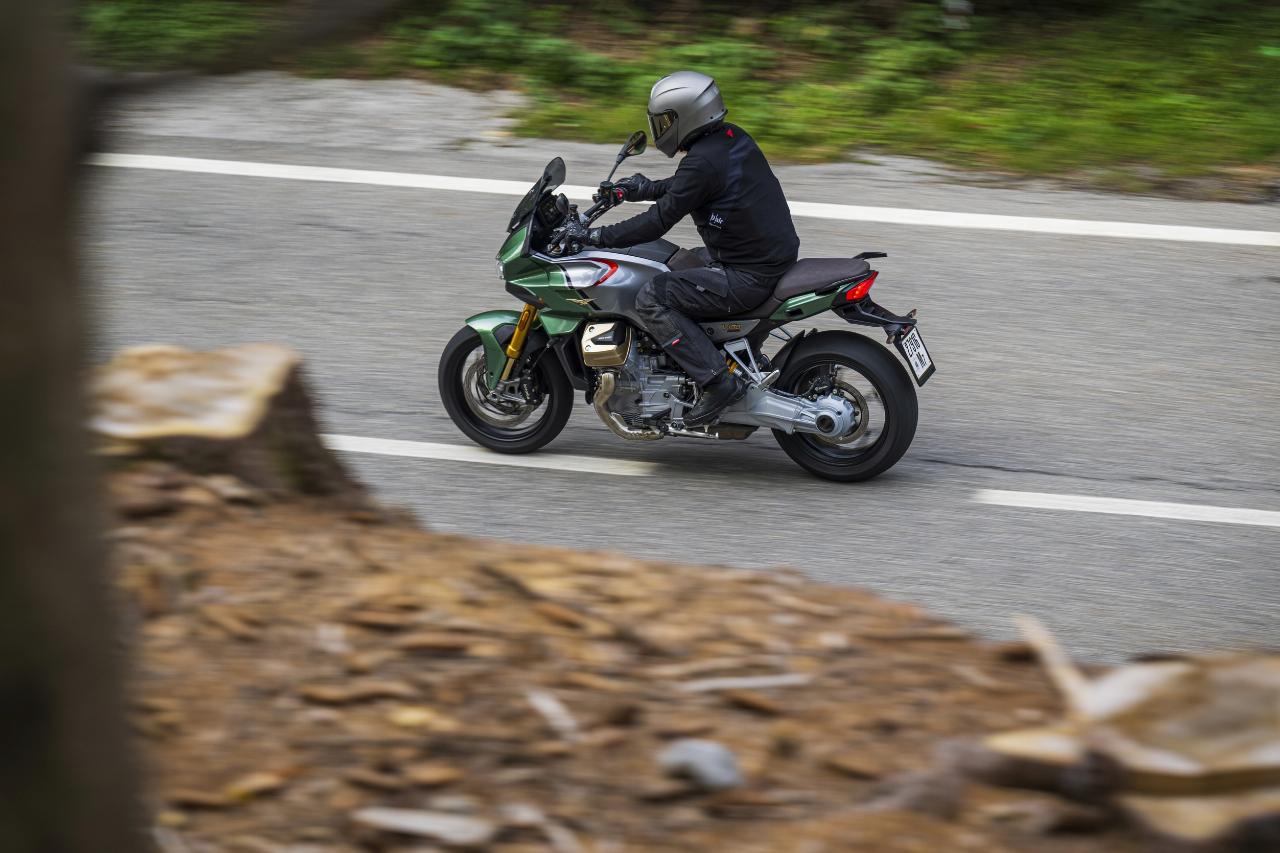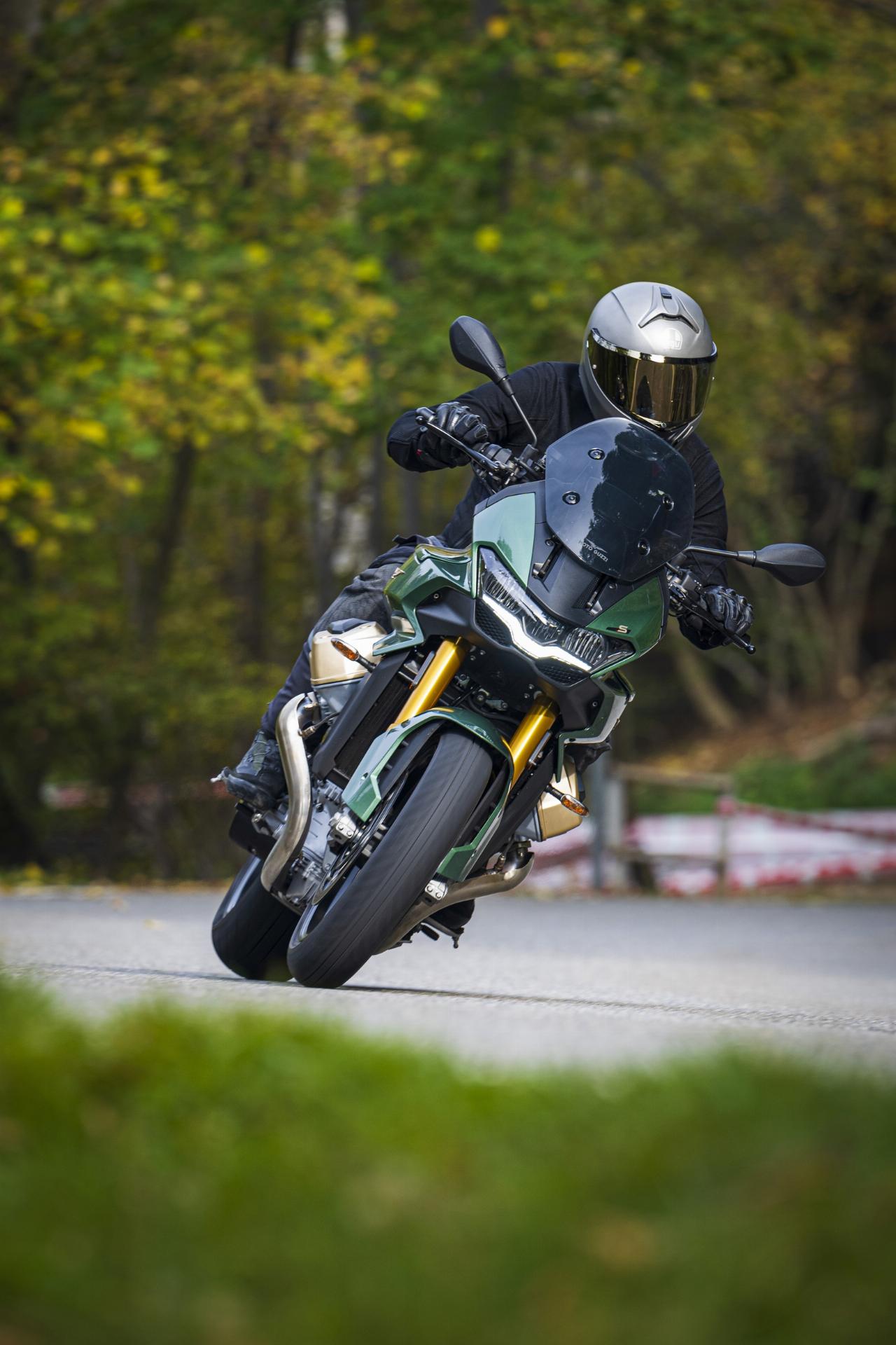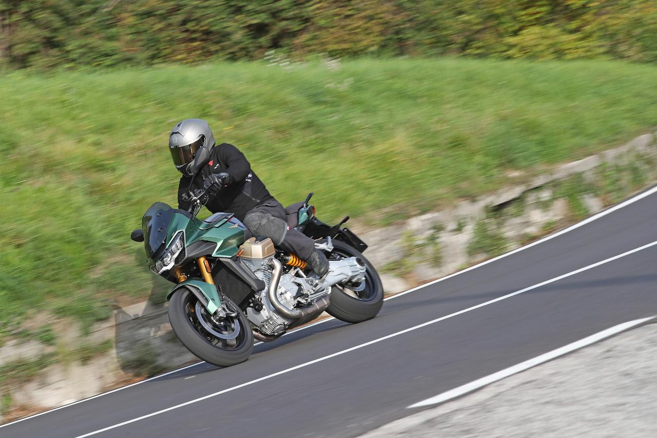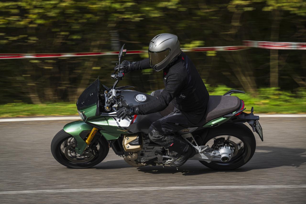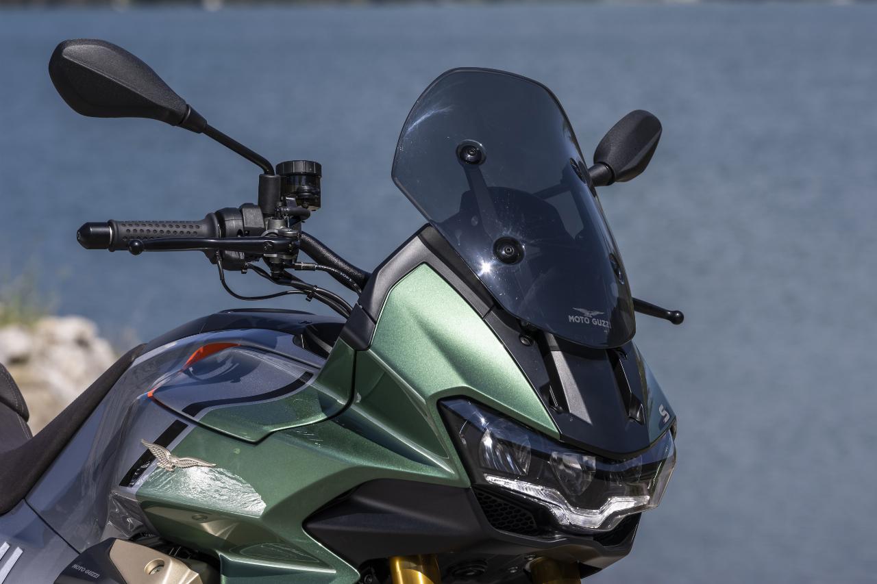 Vier Fahrmodi sind Serie. Motorbremsmoment, Motorkennfelder und Traktionskontrollstufen sind jeweils einstellbar, ebenso die Deflektoren. Im Rain-Modus sind sie werksseitig permanent geöffnet, im Tour-Modus je nach gewählter Geschwindigkeit. In den Fahrprogrammen Sport und Road bleiben sie geschlossen, solange der Fahrer sie nicht im Menü aktiviert. Das Superhirn der neuen Guzzi umfasst unter anderem die elektronische Drosselklappensteuerung Ride-by-Wire für die präzise Abstimmung von Leistung und Verbrauch und die Sechs-Achsen-Inertiaplattform (IMU). Letztere ist durch ihre Beschleunigungsmesser und Gyroskope in der Lage, die Position der Maschine im Verhältnis zur Fahrbahn zu erkennen. Auf diese Weise kann sie das Sicherheits-Potenzial der schräglagenabhängigen Assistenzsysteme wie Traktionskontrolle und Kurven-ABS voll ausschöpfen.