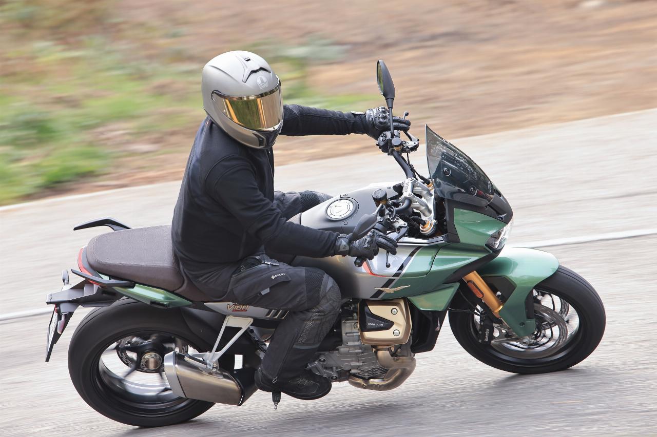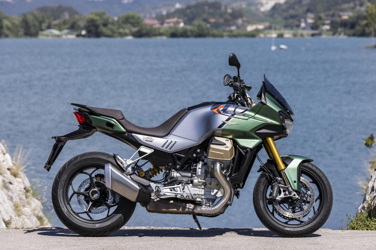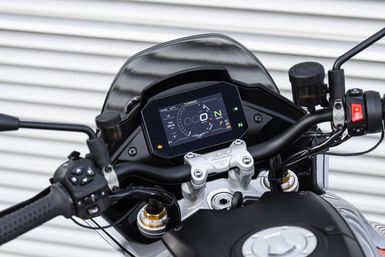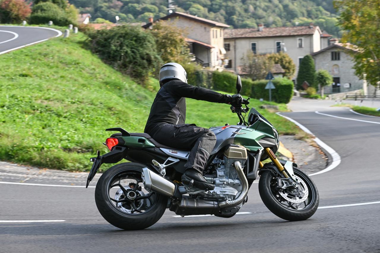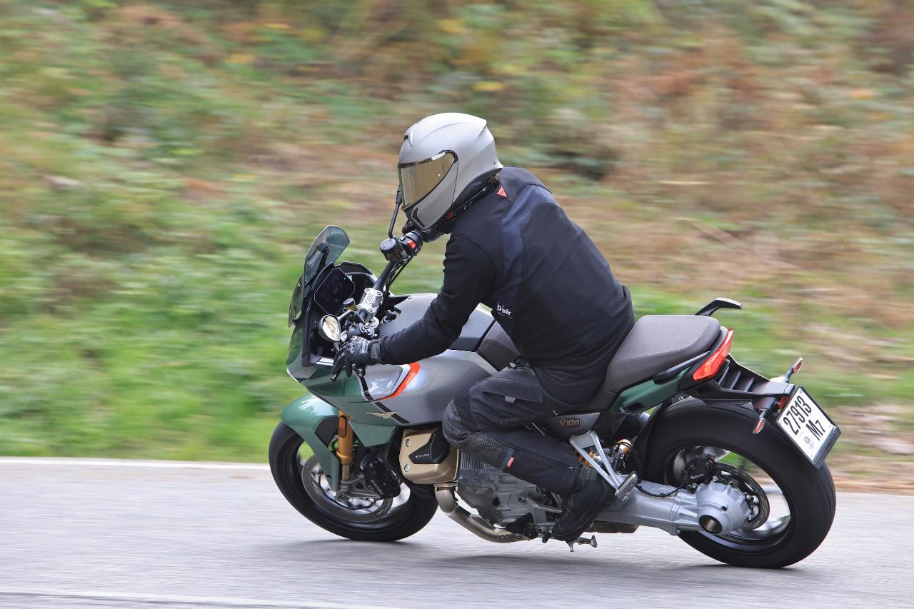 Vier Fahrmodi sind Serie. Motorbremsmoment, Motorkennfelder und Traktionskontrollstufen sind jeweils einstellbar, ebenso die Deflektoren. Im Rain-Modus sind sie werksseitig permanent geöffnet, im Tour-Modus je nach gewählter Geschwindigkeit. In den Fahrprogrammen Sport und Road bleiben sie geschlossen, solange der Fahrer sie nicht im Menü aktiviert. Das Superhirn der neuen Guzzi umfasst unter anderem die elektronische Drosselklappensteuerung Ride-by-Wire für die präzise Abstimmung von Leistung und Verbrauch und die Sechs-Achsen-Inertiaplattform (IMU). Letztere ist durch ihre Beschleunigungsmesser und Gyroskope in der Lage, die Position der Maschine im Verhältnis zur Fahrbahn zu erkennen. Auf diese Weise kann sie das Sicherheits-Potenzial der schräglagenabhängigen Assistenzsysteme wie Traktionskontrolle und Kurven-ABS voll ausschöpfen.