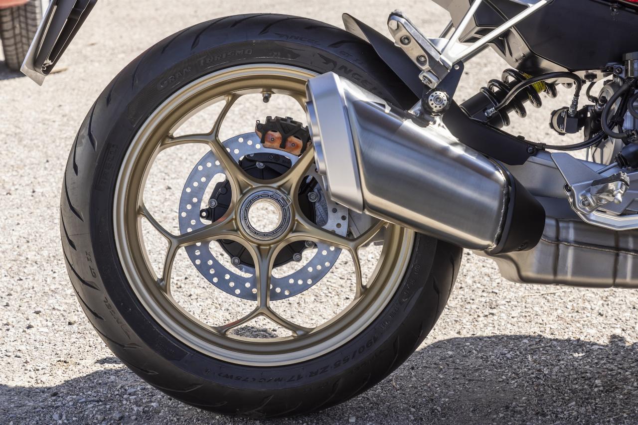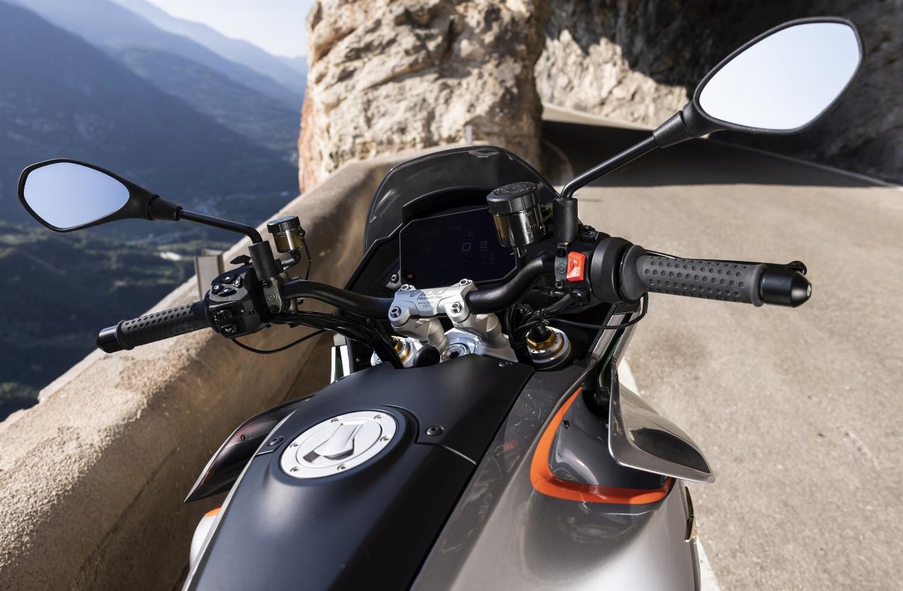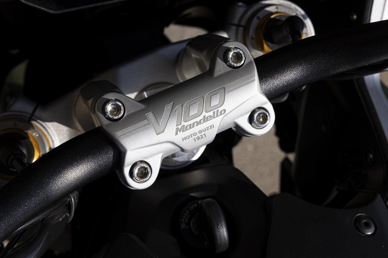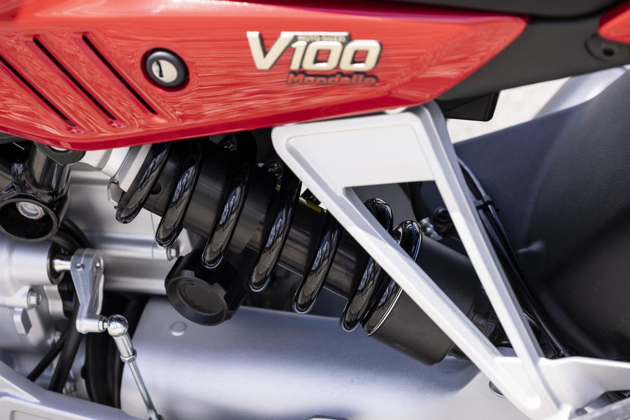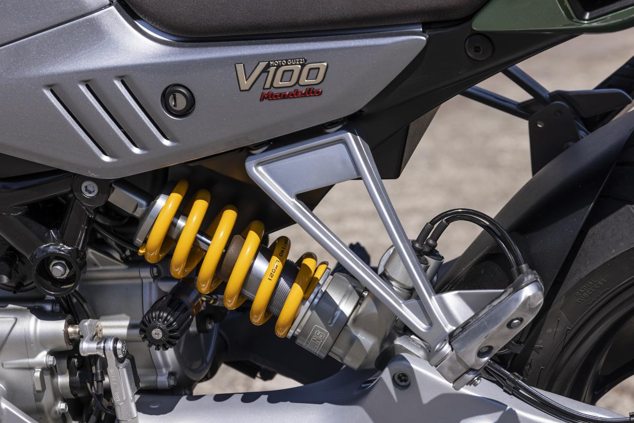Zwei Versionen bietet Moto Guzzi an: die V100 Mandello mit voll einstellbarer Kayaba-Federung und die Mandello S mit elektronischem Öhlins-Fahrwerk. Die semiaktive State-of-the-Art-Federung namens Smart EC 2.0 verhilft auch leistungsstarken Straßenrennern wie Ducati Streetfighter V4 S und Triumph Speed Triple 1200 RR zu überragenden Fahreigenschaften. Bei Moto Guzzi kommt erstmals ein Fahrwerk dieser Art zum Einsatz. „Das System kann den Asphalt quasi lesen und die Abstimmung der Maschine in Echtzeit an die Fahrbahngegebenheiten anpassen“, erklärt Fabio Gilardenghi, Chef- Kommunikator von Konzernmutter Piaggio.