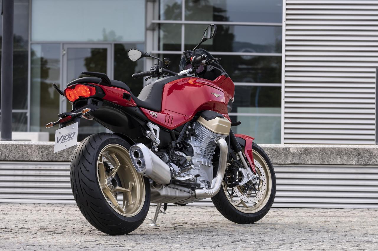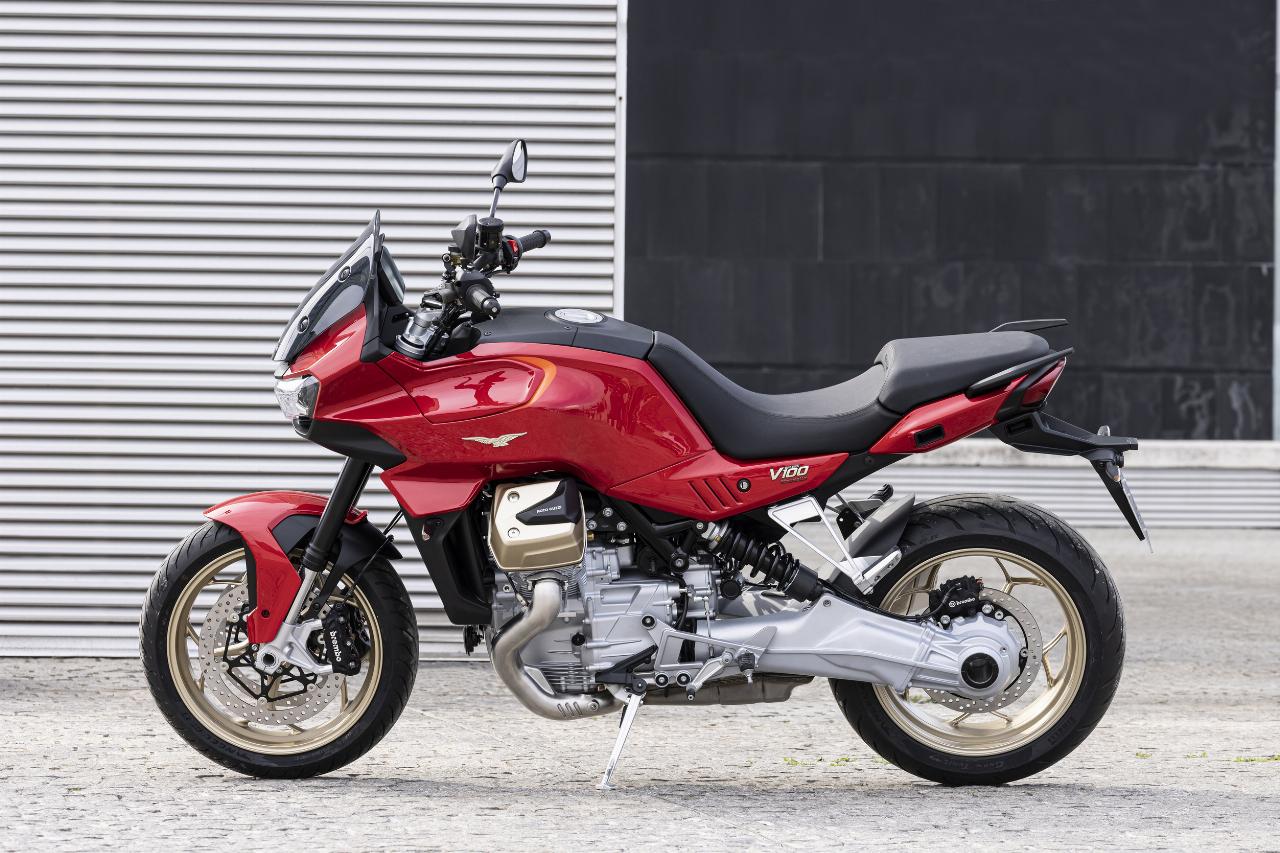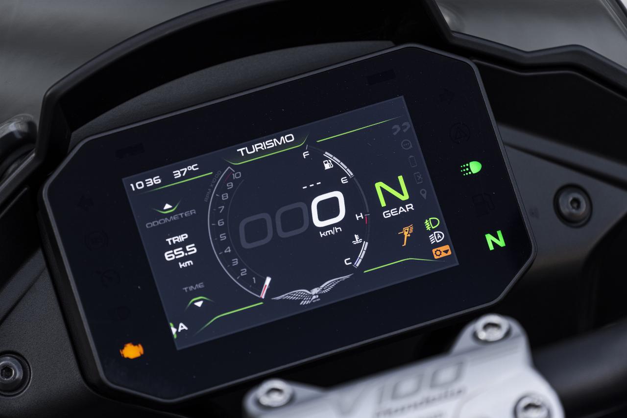 „Der Charakter eines Roadsters. Die Seele eines Tourers“ – so bewirbt Moto Guzzi die V100. Vertretbare 233 Kilogramm wiegt sie fahrbereit. Die S-Version hat serienmäßig einen Quickshifter an Bord für kupplungsfreies Rauf- und Runterschalten, für die V100 gibt es den Schaltautomaten gegen Aufpreis. Zwischen 3000 und 5000 Touren macht er seine Sache gut. Alternativ kann natürlich jederzeit die hydraulische Mehrscheiben-Antihopping-Kupplung im Ölbad bemüht werden. Auch diese kommt erstmalig bei einem Moto-Guzzi-V2-Motor zum Einsatz.