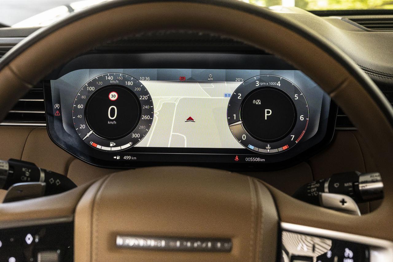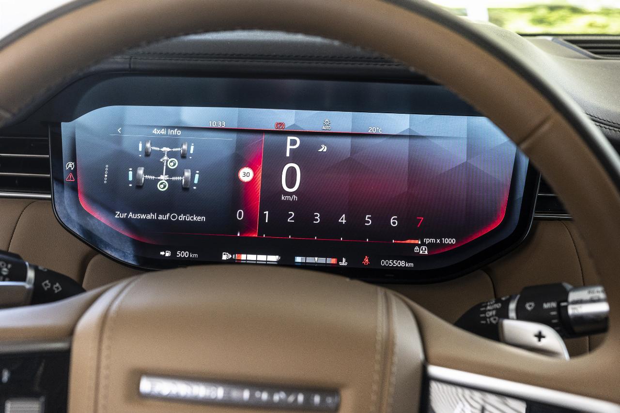 Klar, dass der Fahrer im Range Rover auf konfigurierbare Digitalinstrumente blickt. Genauso modern gibt er sich in Sachen Infotainment. Mit seinem ausladenden 13,1-Zoll-Touchscreen ist er bestens vernetzt. Das System ist klar gegliedert und mit jedem Tastendruck erfolgt eine haptische Rückmeldung. Hinzu kommt ein WLAN-Hotspot für bis zu acht Mobilgeräte. Ebenso zählt beim Pivi-Pro-Multimedia das Streamen von Musik über den Anbieter Spotify dazu, genauso wie die Sprachsteuerung über Alexa. Anstehende Updates erhält das einfach zu handhabende System ganz modern Over-the-Air und glücklicherweise gibt es neben dem einfach händelbaren Infotainment noch genug physische Schalter und Drehregler, die einem Bedienung erleichtern.