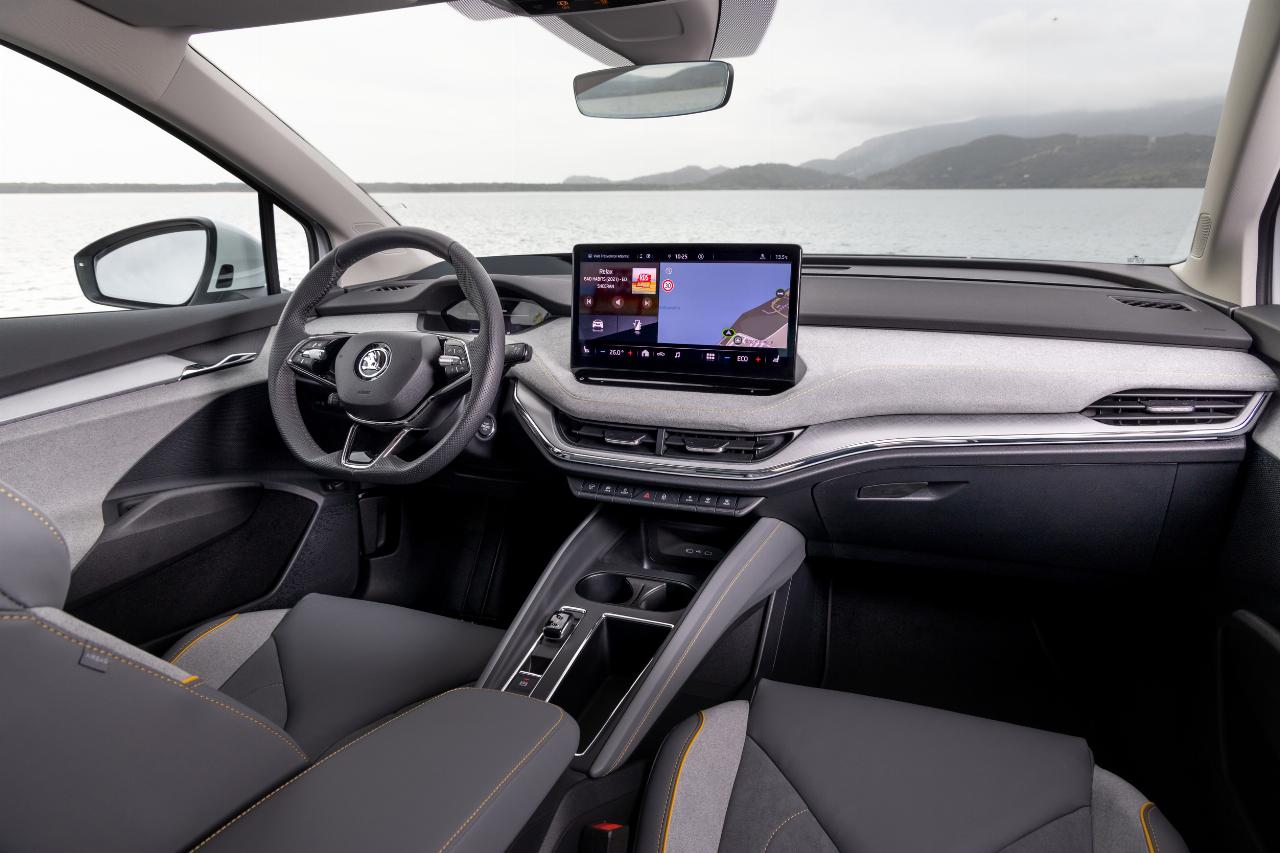 Auch im Interieur pflegt Skoda einen eigenen Stil – mit großzügigen, horizontal betonten Formen, modernen Materialien und einem eleganten Zwei-Speichen-Lenkrad, das lediglich bei den sportlichen Varianten einem konventionell wirkenden Drei-Speichen-Lenkrad weicht. Der Bildschirm hinter dem Lenkrad ist kompakter als bei VW ausgefallen, und beim Zentralbildschirm sowie beim Wählhebel, der hier auf der Mittelkonsole sitzt, gibt es wichtige Abweichungen: Der berührungsempfindliche, nachts leider unbeleuchtete Lautstärkeregler muss sich den Platz hier nicht mit dem Temperaturregler teilen, Fehlbedienungen sind damit im Gegensatz zu VW ausgeschlossen. Der Wählhebel für das Getriebe funktioniert klassisch-intuitiv: Ziehen zum Losfahren, nach vorn drücken zum Reversieren. Und damit andersherum als der konfuse Hebel, der bei VW an der Instrumentierung sitzt.