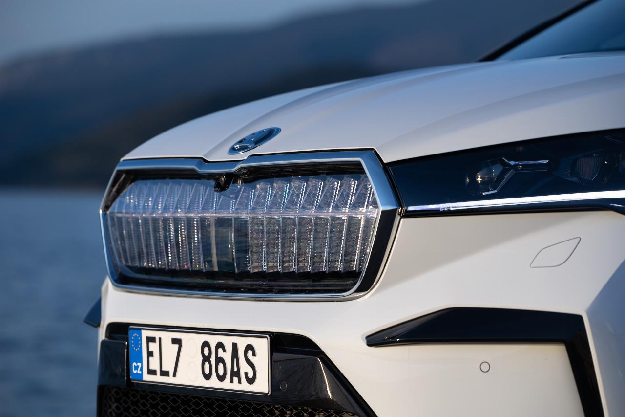 Genau wie das Basismodell zeichnet sich das Enyaq Coupé durch eine dominant wirkende Frontpartie aus, mit einer Frontmaske, die gegen Aufpreis beleuchtet ausgeführt ist. Im Gegensatz zu Volkswagen verzichtet Skoda auf ein spezifisches Elektro-Gesicht, und das kommt nicht nur bei den Kunden gut an: Aus dem Konzern ist zu hören, dass nicht wenige VW-Mitarbeiter den Skoda gelungener finden.