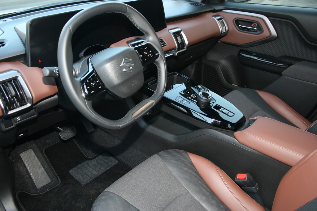 Das Ambiente, insbesondere in der zweifarbigen Ausführung, ist einladend. Das 10,25 Zoll große digitale Kombiinstrument und der 10,1-Zoll-Bedientouchscreen sind zu einer Einheit zusammengefasst und bieten jeweils auch die Möglichkeit eines dreifach geteilten Bildschirms. Eine induktive Ladeschale sowie jeweils ein Mini-USB- und USB-C-Anschluss vorne und hinten sorgen für die nötige Smartphoneeinbindung. Das Navigationssystem wird über Android-Auto oder Apple-Carplay gesteuert. Die Kommandazentrale in der Mittelkonsole überspannt das Ablagefach und reicht den Drehschalter und die Tasten für die primären Fahrfunktionen übersichtlich und gut erreichbar dar. Klimatisierung, Belüftung und die Scheibenheizung lassen sich wahlweise statt über den Touchscreen auch direkt über sechs Wipptasten regeln. Die Assistenzsysteme werden wie gewohnt vom Lenkrad aus bedient, nur die dreistufige Rekuperationseinstellung versteckt sich im Menü des Bordcomputers, wobei der e-Vitara kein One-Pedal-Niveau erklimmt.