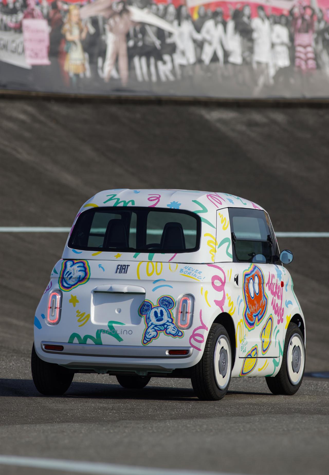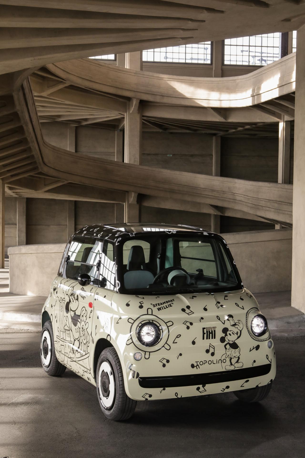 Ein weiteres Topolino-Unikat widmet sich der Historie und greift Motive des legendären Disney-Kurzfilms „Steamboat Willie“ auf, bei dem Micky Maus als Steuermann eines Raddampfers zu erkennen ist. Der dritte Wagen wurde dagegen von moderner Kunst inspiriert und trägt auf seiner Karosserie prominent die Initialen der Comicfigur. Die abstrakte Lackierung des vierten Topolino soll die Kreativität von Walt Disney symbolisieren, während das fünfte Modell das Thema Street Art aufgreift. Die mit reichlich Graffiti verzierte Karosserie soll die fröhlich-urbane Seite von Micky Maus unterstreichen.