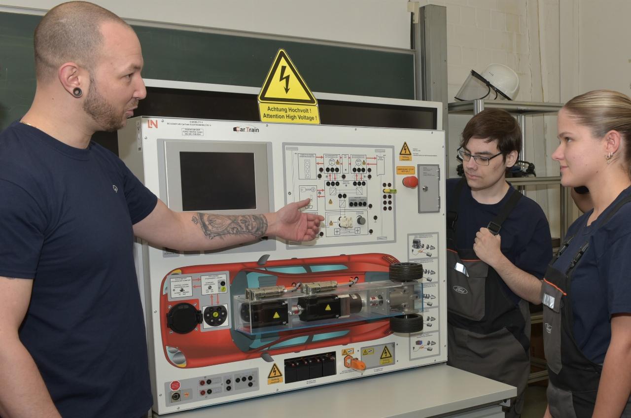 Auch bei der Kfz-Mechatronik setzt Ford auf neue Ausbildungsinhalte: Die Nachwuchs-Fachkräfte lernen parallel die Wartung und Reparatur von Verbrennungsmotoren und Elektroantrieben. Dafür stehen verschiedene Fahrzeugmodelle bereit. Am Hochvoltstand lernen die Azubis beispielsweise, wie der Strom im Fahrzeug zum Antrieb bzw. bei der Rekuperation zurück in die Batterie fließt.