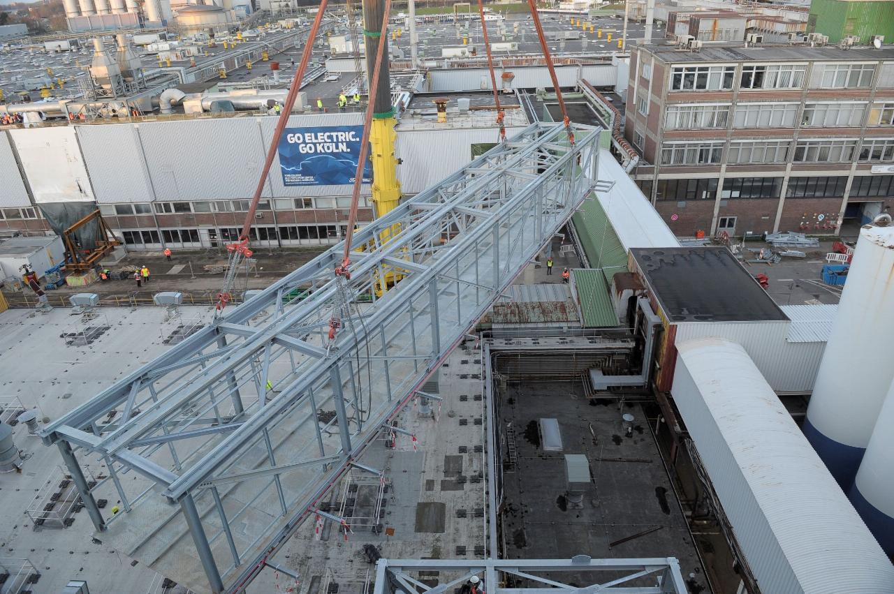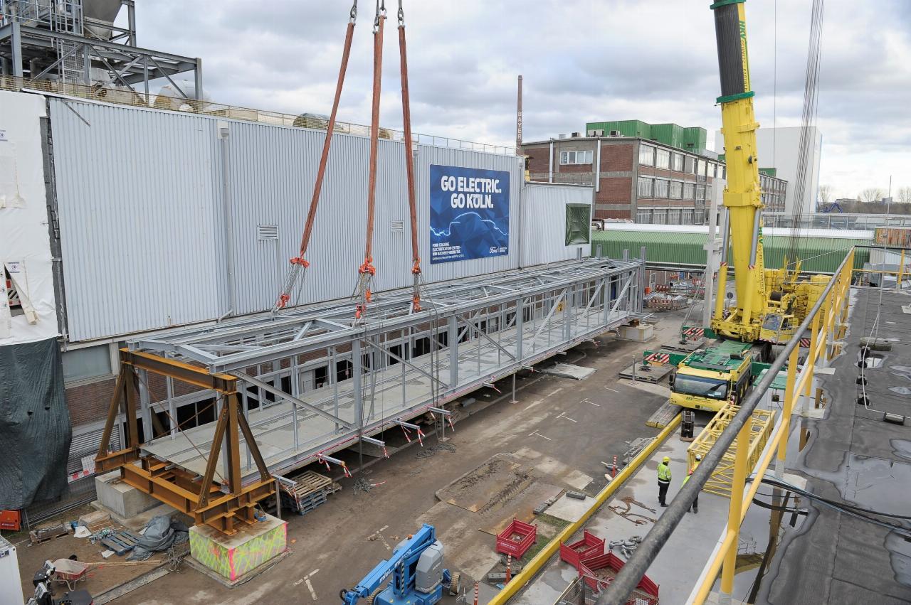 Das erste, zwölf Meter lange Turmbrückenstück war vergangenen Monat an ein neues Gebäude zur Lackvorbehandlung angebaut worden. Die letzten fehlenden elf Meter werden nun analog zusammengebaut und in acht Metern Höhe mit dem langen Teilstück und einer Halle verbunden, in der der übrige Lackbereich sowie die Trockenöfen untergebracht sind. Durch die 4,80 Meter breite und am Ende 62 Meter lange Überführung werden die Karossen von der Tauchlackierung zu den Trockenöfen befördert. Die Umstellung der gesamten Logistik in der Lackerierung ist nötig, um Ende des Jahres mit der Produktion eines neuen vollelektrischen Volumenmodells zu beginnen, dessen Karosserie schwerer ist als die des aktuellen Fiesta.