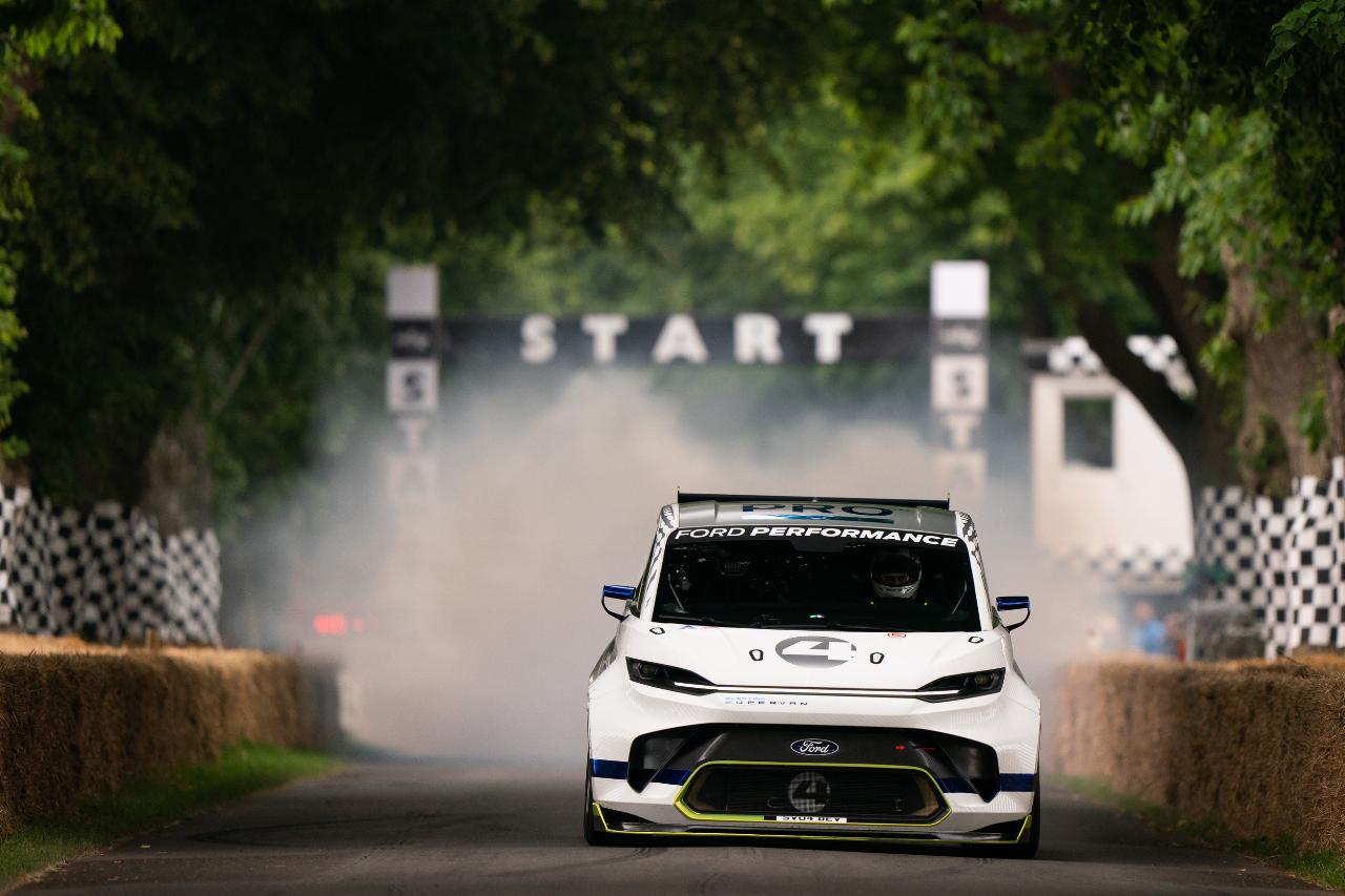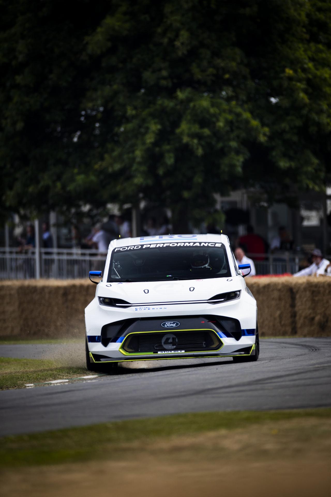 Den Ford Pro Electric Supervan, den in Goodwood der zweifache Le-Mans-Sieger Romain Dumas über die rund 1,9 Kilometer lange Bergstrecke pilotiert, ist mit einem FIA-konformen Innenraum ausgestattet. Über den Touchscreen stehen fünf Fahrprogramme zur Wahl. Sie definieren jeweils eine andere Drehmomentverteilung an die vier angetriebenen Räder und beeinflussen die Rekuperation: Road, Track, Drag(ster), Drift und Rally.