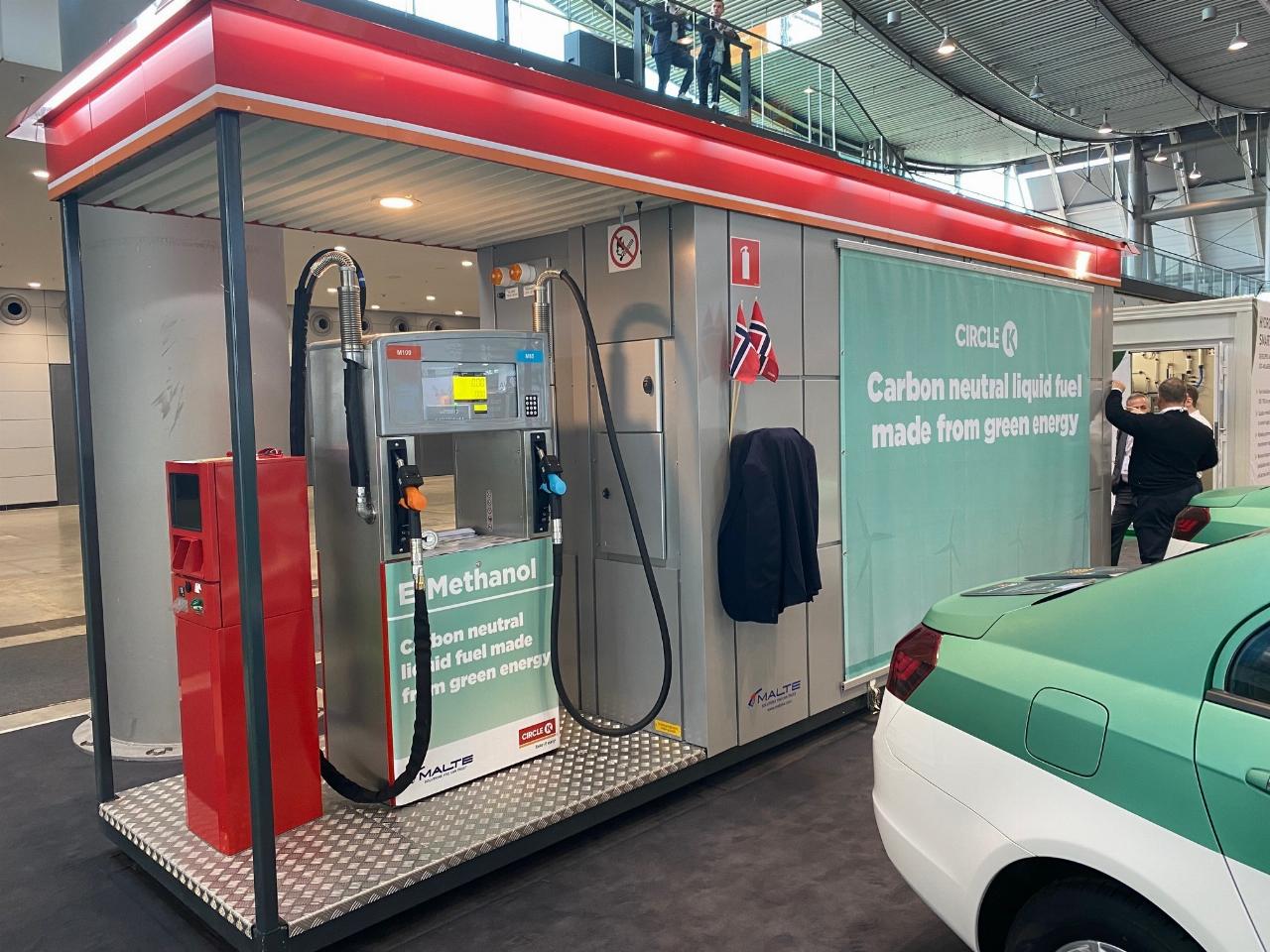 Um die Einfachheit und Kosteneffizienz einer solchen Lösung zu demonstrieren, präsentierte Circle K in Stuttgart einen Container mit einer Zapfsäule für Benzin und für Methanol. Im Container sind zwei Tanks für 7500 Liter Methanol und 2500 Liter Benzin. Diese Anlage kann im Prinzip an jeder Tankstelle aufgestellt werden. Die Kosten liegen bei rund 200.000 Euro. Zum Vergleich: Eine Wasserstoff-Tankstelle kostet zwischen 1,0 und 2,5 Millionen Euro.