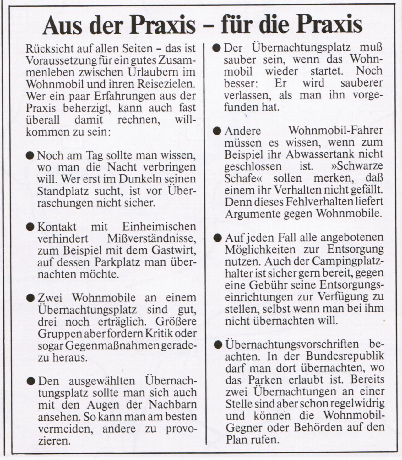 Wir lockten beide Seiten – die Wohnmobilisten mit Stellplätzen und die Stellplatzbesitzer mit Geld. Wir rechneten vor, dass jedes Wohnmobil pro Tag in der Gemeinde etwa 100 DM ausgibt, unter anderem in der Gastronomie. Und wir versprachen, dass nur autarke Fahrzeuge kommen würden, deren Insassen sich zu benehmen wüssten. Dafür hatten wir eine „Hausordnung“ entwickelt. Und tatsächlich zeigte sich dann später nach der ersten Saison, dass nur ein Selbstausbauer mit klapprigem Bulli richtig negativ aufgefallen war. Er hatte auf dem asphaltiertn Parkplatz über einem Lagerfeuer nach Westernart gekocht.