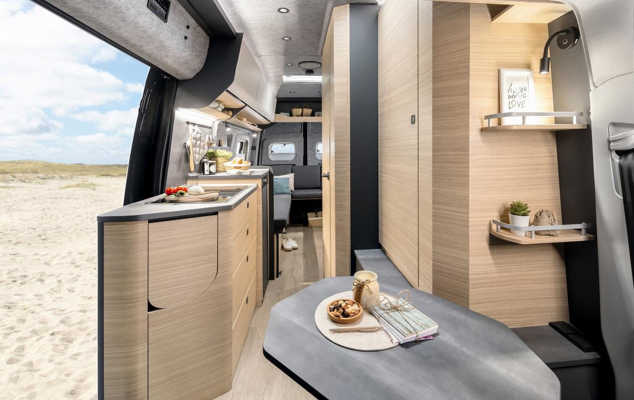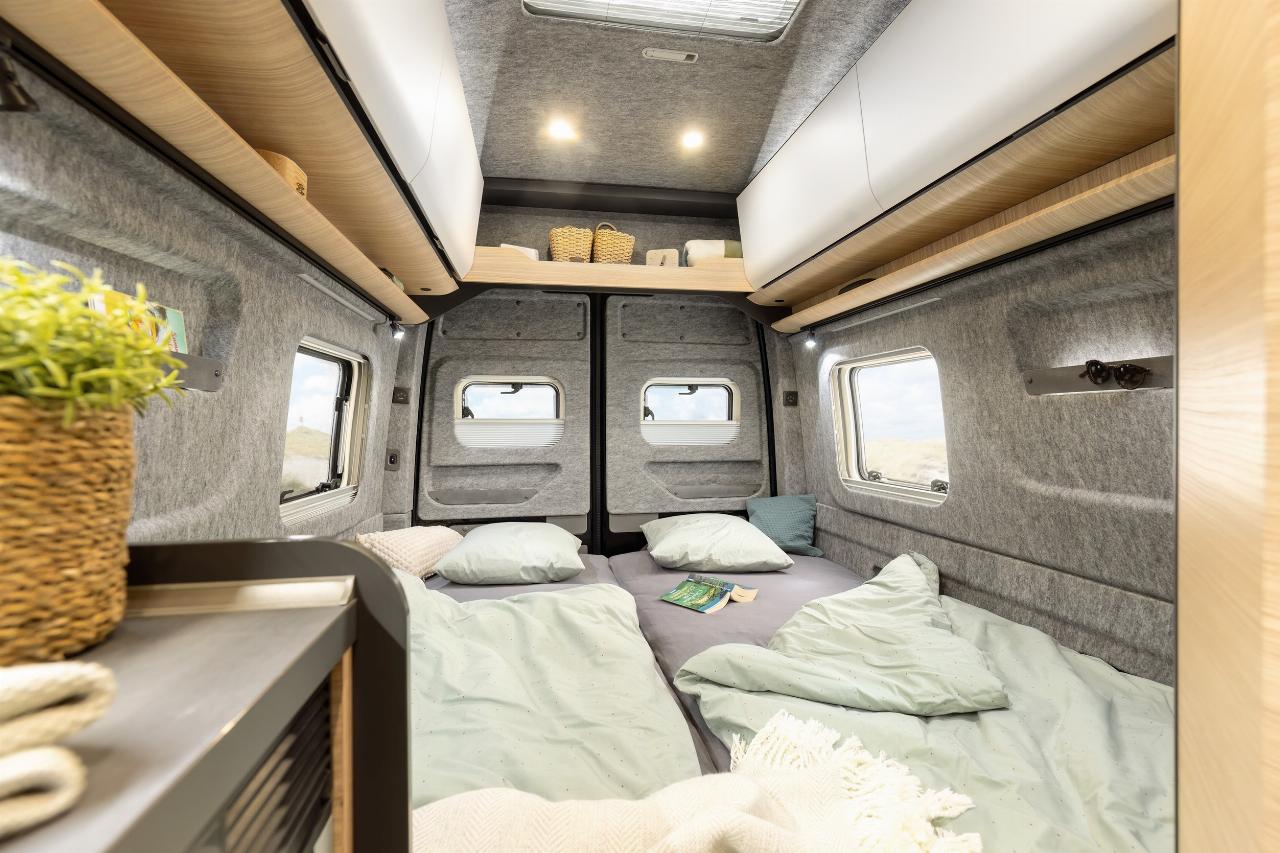 Im vorderen Bereich gibt es unter Einbeziehung der Drehsessel von Fahrer und Beifahrer eine Sitzgruppe für zwei Personen und einem geräumigen Schrank der wahlweise mit einer Kleiderstange oder zwei Einlegeböden bestückt werden kann. Der drehbare Säulenschwenktisch lässt sich passgenau einstellen oder sich im serienmäßigen Doppelboden verstauen. Im Heck ist die Möblierung variabel, tagsüber steht eine Face-to-Face-Sitzgruppe bereit, abends wird sie zur gemütlichen Rundsitzgruppe und nachts zum Einzel- oder Doppelbett mit zwei Meter Länge. Dreistufige Polster- und ein Lattenrost sorgen für guten Schlafkomfort.