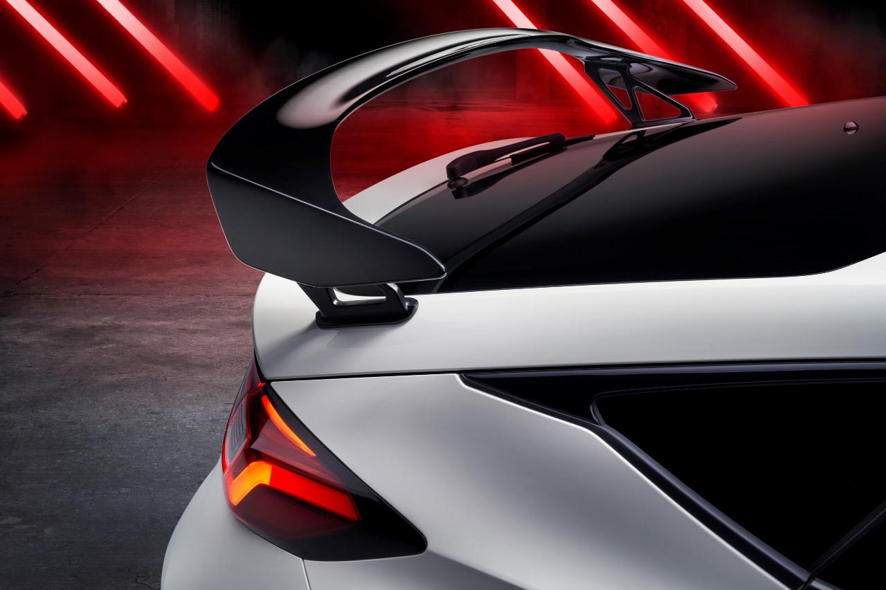 Der große untere Kühlergrill des vorderen Stoßfängers versorgt den Motor mit Luft. Die Entlüftungsöffnung auf der neuen Motorraumklappe optimieren den Luftstrom. Weitere Designdetails, die zur Verbesserung der Aerodynamik beitragen, sind die großen Luftauslässe hinter den Vorderrädern sowie ein größerer Heckdiffusor. Der ist direkt in den Unterboden integriert. Der spektakuläre neue Heckspoiler sorgt für mehr Abtrieb. Er wurde nach hinten geneigt, um den Luftwiderstand zu verringern. Der Heckflügel sitzt gleichzeitig niedriger und breiter als beim Vorgängermodell. Das betont die schlanke Dachlinie und die breitere Silhouette.