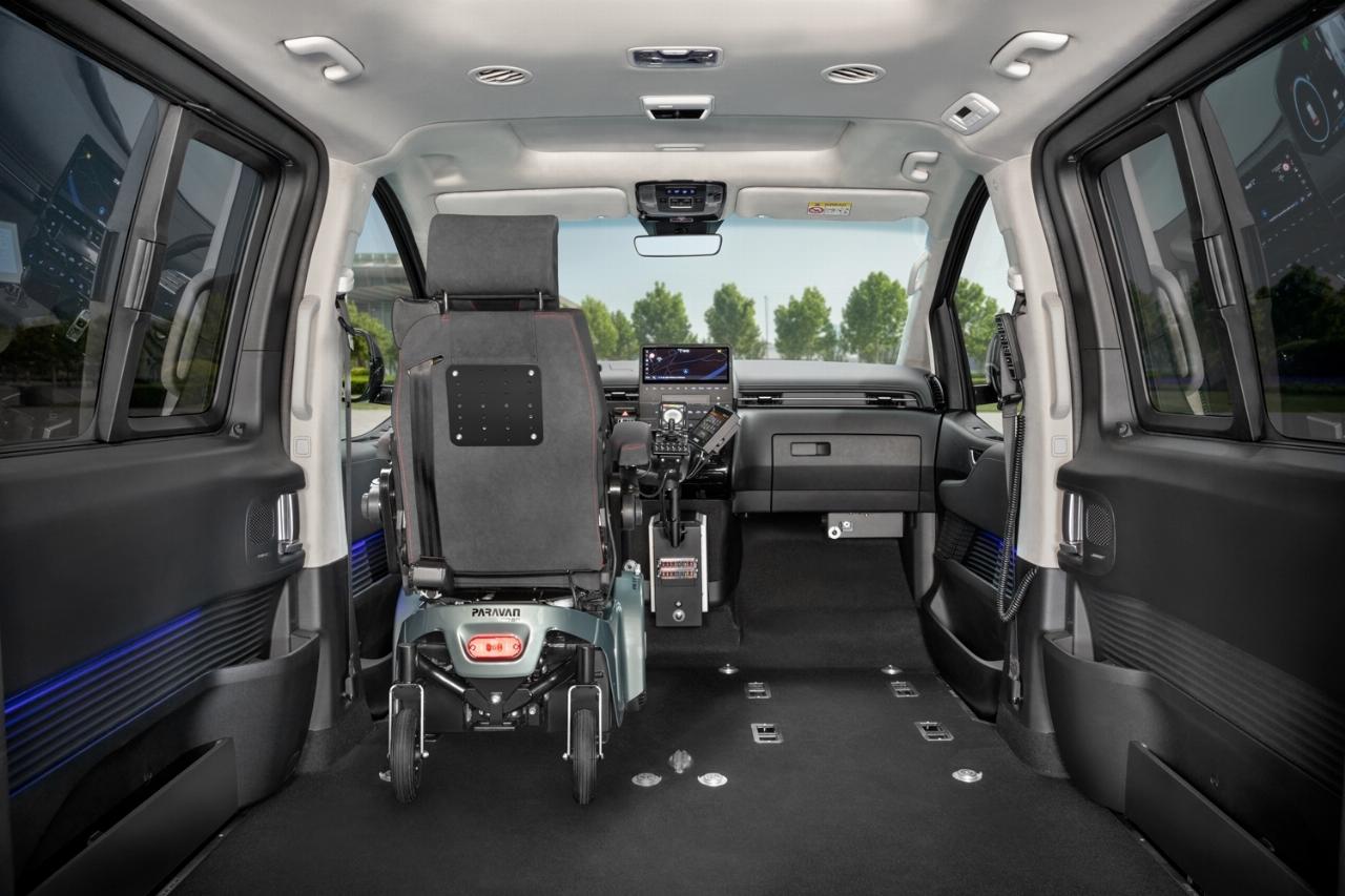 Um die nötige Kopffreiheit zu gewährleisten, wird beim Umbau der Fahrzeugboden des Staria von der A- bis zur C-Säule tiefergelegt. So entsteht ein barrierefreier Innenraum mit einer Höhe von 1,40 Meter, in dem neben dem Rollstuhl auch noch Platz für eine Sitzreihe für drei Personen ist. Der Großraumvan ist flexibel anpassbar und kann beispielsweise mit einem Kassettenlift und einer Transferkonsole von Paravan ausgerüstet werden.