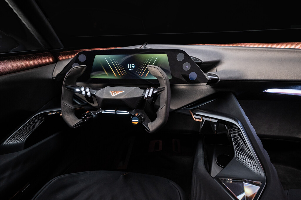 Das Interieur mit minimalistischem Gaming-Lenkrad wirkt beinahe freischwebend. Die Sitze sind an der Mittelkonsole aufgehängt. Zentrales Bedienelement des Viersitzers ist ein 24 Zoll großes frei stehendes Display. Als Schalter für viele Funktionen wie Fahrmodi oder Licht dient ein Glasprisma. Für den Innenraum wurde viel Bio-Material verwendet. (aum)