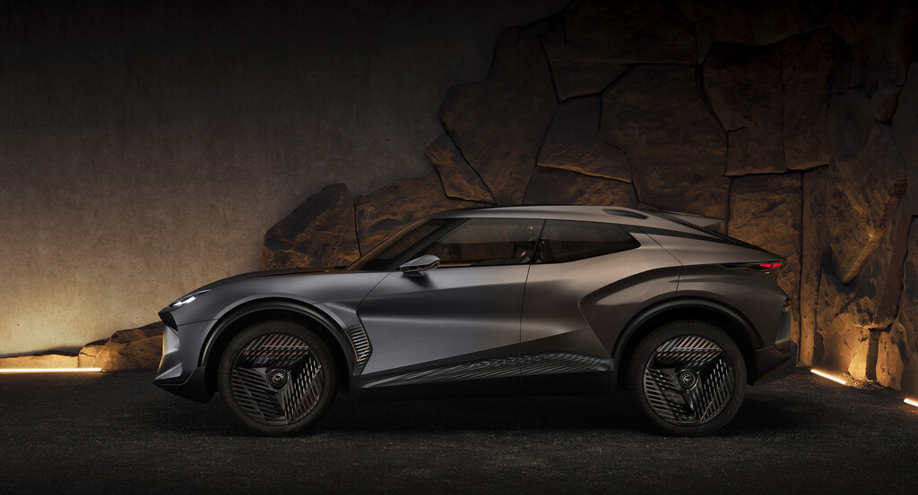Die Logos an Front und Heck sind feuerrot beleuchtet, eine markante Sharknose und dreieckige Lichtelemente in den Scheinwerfern erinnern ebenso wie die skulpturalen Seitenlinien und der markante Doppelspoiler am Heck an scharfkantiges Gestein. Das 4,72 Meter lange Showcar steht auf mächtigen 23-Zoll-Felgen, das Greenhouse macht etwa ein Drittel der Karosserie aus. Das Dach trägt einen Y-förmigen zentralen Strukturträger mit zwei abnehmbaren Paneelen.