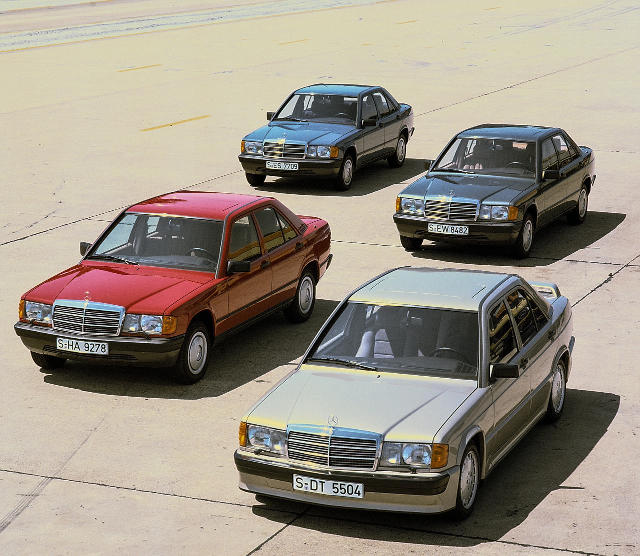 Die Vergaservariante des ersten 190 im Jahr 1982 leistet 66 kW (90 PS), der mit einer Benzineinspritzung ausgerüstete 190 E 90 kW (122 PS). Danach wird die Motorenpalette kontinuierlich erweitert. 1983 erscheint der 190 D (53 kW/72 PS), der „Flüsterdiesel“ mit schalldämmender Triebwerkskapselung. Die Reihe der erfolgreichen Sechzehnventiler beginnt 1984 mit dem 190 E 2.3-16 (136 kW/185 PS), der 1988 durch den 190 E 2.5-16 (143 kW/195 PS) abgelöst wird. Für Einsätze im Motorsport entstehen 1989 und 1990 die Homologationsmodelle 190 E 2.5-16 Evolution sowie 190 E 2.5-16 Evolution II. Im letzten Produktionsjahr 1992 stellt Mercedes-Benz die Avantgarde-Ausführungen von 190 E 1.8, 190 E 2.3 und 190 D 2.5 als Sondermodelle vor.