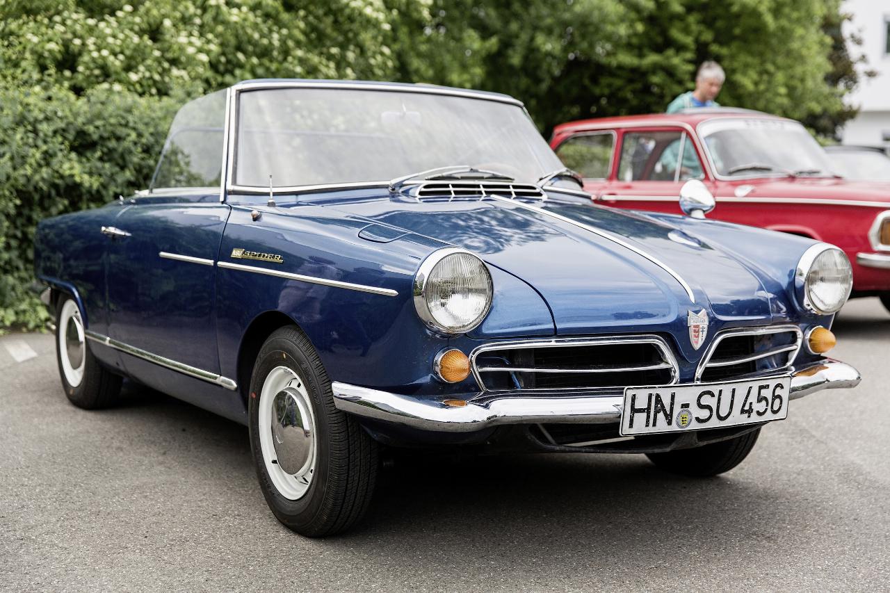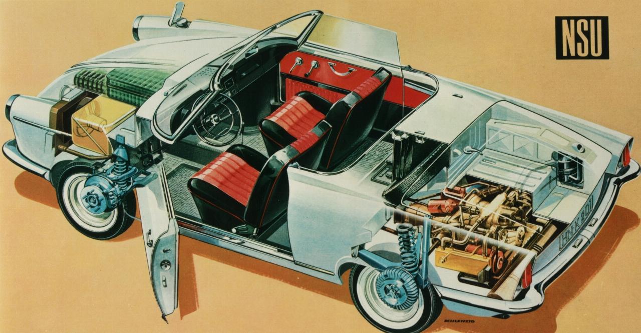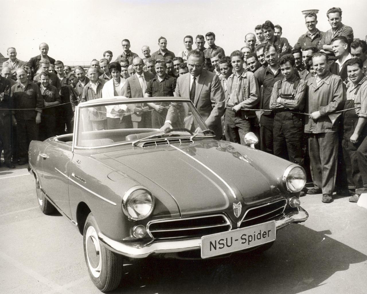 Im September 1963 war es endlich soweit: Kurz vor der Internationalen Automobilausstellung in Frankfurt stand das Werk Neckarsulm für eine Stunde still, als der damalige NSU-Vorstandsvorsitzende Dr. Gerd Stieler von Heydekampf den Beschäftigten offiziell den „NSU-Spider“ vorstellte, wie er damals offiziell hieß. Der Beifall war groß – die Erwartungen waren es auch. Der neue und von Designerikone Bertone gezeichnete Sportwagen war ein absoluter Hingucker. Auf der Frankfurter Automobil-Ausstellung wurde das Auto euphorisch gefeiert, vor allem wegen seines revolutionären Motors. Der Antrieb war leicht – mit Getriebe, Lichtmaschine und Anlasser lag das Gesamtgewicht bei gerade einmal 125 Kilogramm – und brauchte wenig Platz. Der Wankel war deshalb als Unterflurmotor im Heck montiert, wodurch der Spider sowohl einen Kofferraum vorn als auch hinten besaß.
