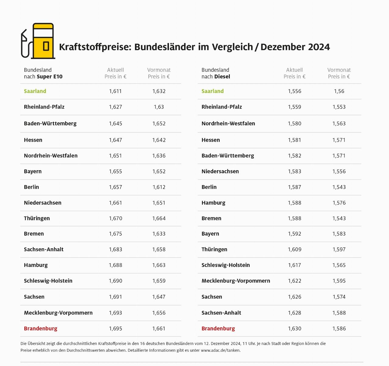 Bei Diesel ergibt sich – zumindest bei den beiden Spitzenplätzen und beim Letztplatzierten – das gleiche Bild. Das Saarland liegt mit 1,556 Euro auf Platz 1, wieder gefolgt von Rheinland-Pfalz mit 1,559 Euro. In Brandenburg als Schlusslicht kostet ein Liter Diesel 1,630 Euro. Vorletztes Bundesland ist hier Sachsen-Anhalt mit 1,628 Euro je Liter.