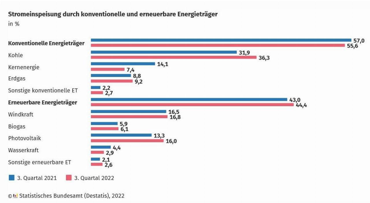 Die Stromerzeugung aus erneuerbaren Energien stieg im 3. Quartal 2022 gegenüber dem 3. Quartal 2021 um 2,9 Prozent. Dabei nahm die Einspeisung aus Windkraft um 1,0 Prozent zu und machte 16,8 Prozent der eingespeisten Strommenge aus (3. Quartal 2021: 16,5 Prozent). Die Einspeisung aus Photovoltaik stieg um 20,3 Prozent auf einen Anteil von 16,0 Prozent (3. Quartal 2021: 13,3 Prozent). Der starke Anstieg bei der Photovoltaik lag hauptsächlich an der ungewöhnlich hohen Zahl an Sonnenstunden. In der Summe stieg der Anteil der erneuerbaren Energien an der Stromerzeugung von 43,0 Prozent im dritten Quartal 2021 auf 44,4 Prozent im dritten Quartal 2022.