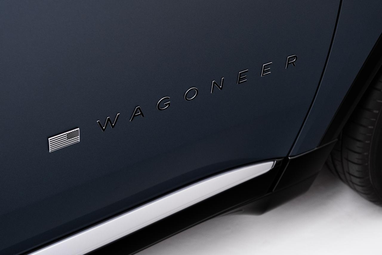 Das Design des Wagoneer S bleibt der typischen Jeep-Ästhetik treu, jedoch mit modernen Akzenten. Der markentypische Grill mit sieben Schlitzen ist nun geschlossen und lediglich aus optischen Gründen vorhanden. Bei Annäherung an das Fahrzeug wird der Grill illuminiert. Die aerodynamische Silhouette wird durch eine flach liegende Windschutzscheibe und eine nach unten gekrümmte Fronthaube bestimmt. Die Dachlinie fällt nach hinten leicht ab und endet in einem Dachspoiler. Integrierte Türgriffe und ein glatter Unterboden sorgen für eine verbesserte Aerodynamik. Das Ergebnis ist ein für SUV beeindruckender cW-Wert von 0,29.