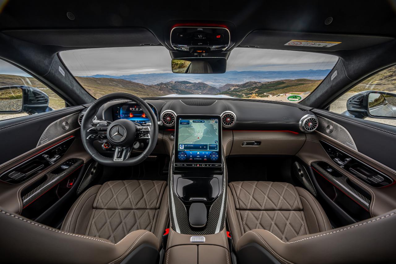 Im Vergleich zum bisherigen AMG GT sind die Proportionen etwas weniger extrem, aber das ist eher ein Vorteil: Man sitzt weiter vorn, das Auto ist übersichtlicher – und lässt sich damit auch auf der Landstraße noch präziser positionieren. Gegenüber dem SL hat AMG allerdings nachgeschärft, vor allem mit einer aggressiven, tiefer gezogenen Frontmaske. Das Interieur ist identisch – bis auf ein kleines Detail: Der im SL zur Vermeidung von Spiegelungen elektrisch neigungsverstellbare Zentralbildschirm ist hier fixiert.