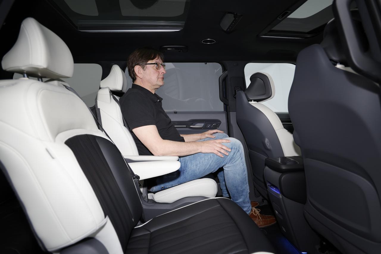 Optional ist der EV9 auch als Sechssitzer mit zwei Einzelsitzen in der zweiten Reihe erhältlich. Zur Wahl stehen dabei Entspannungssitze, ähnlich denen in der ersten Reihe, oder drehbare Sitze, die sich um 90 Grad zur geöffneten Tür hin oder um 180 Grad in Richtung der Passagiere in der dritten Reihe bewegen lassen. Die Einführung der Basisversion des EV9, die auch mit Heckantrieb erhältlich sein wird, erfolgt zu einem späteren Zeitpunkt.