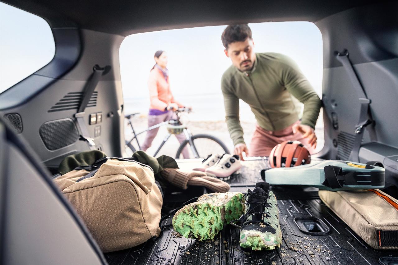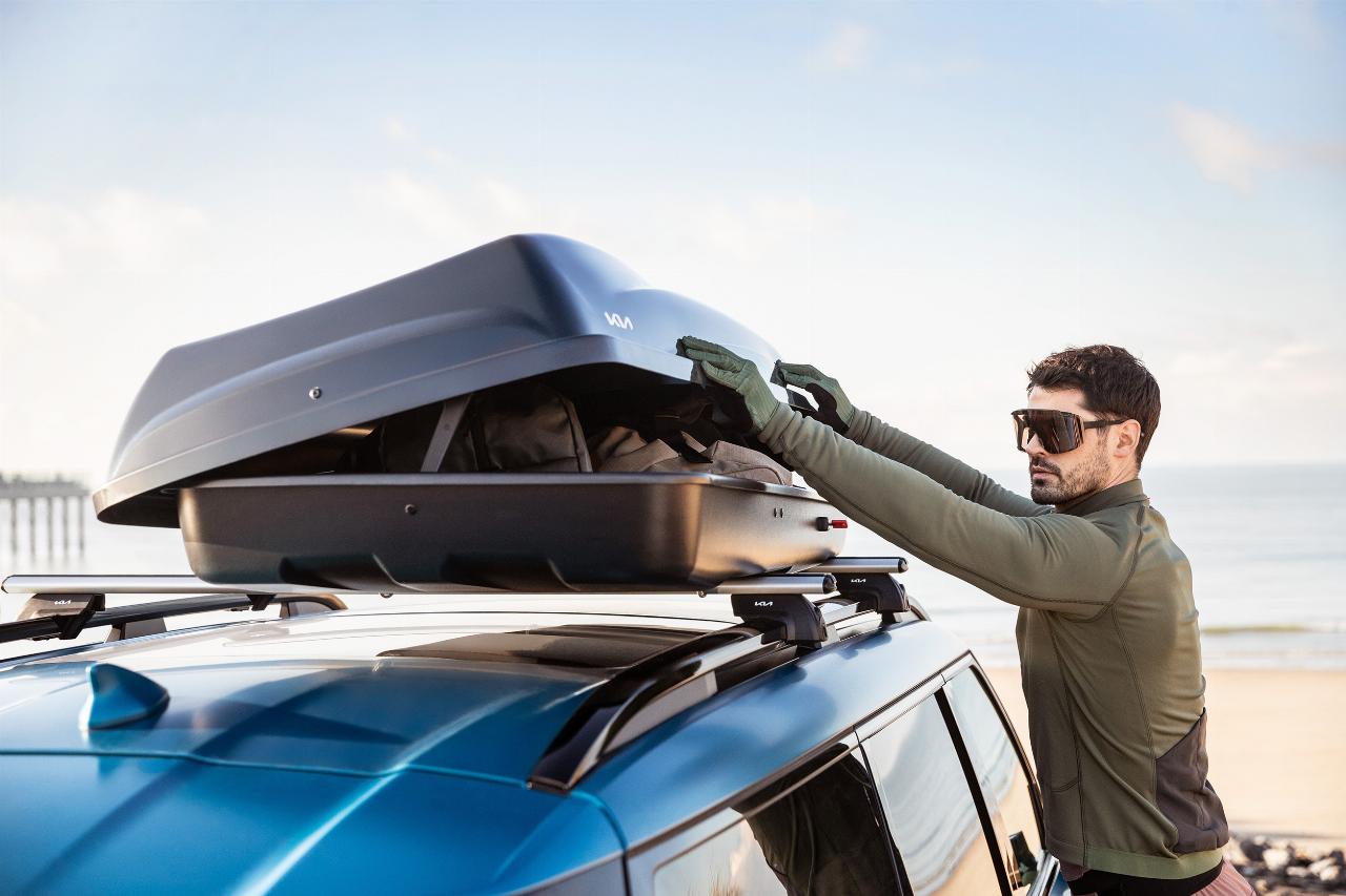 Kia bietet für seinen siebensitzigen Elektro-SUV EV9 nun auch eine breite Palette an Reise- und Freizeitzubehör. Das Spektrum reicht dabei vom aufblasbaren Stand-up-Paddle-Board (360 Euro) über einen Aluminium-Dachträger (473 Euro) plus Dachbox (700 Euro) mit 390 Liter Nutzinhalt bis zu Trenngitter (326 Euro) und einer Schutzwanne für den Gepäckraum, in der nasse oder schmutzige Dinge deponiert werden können.