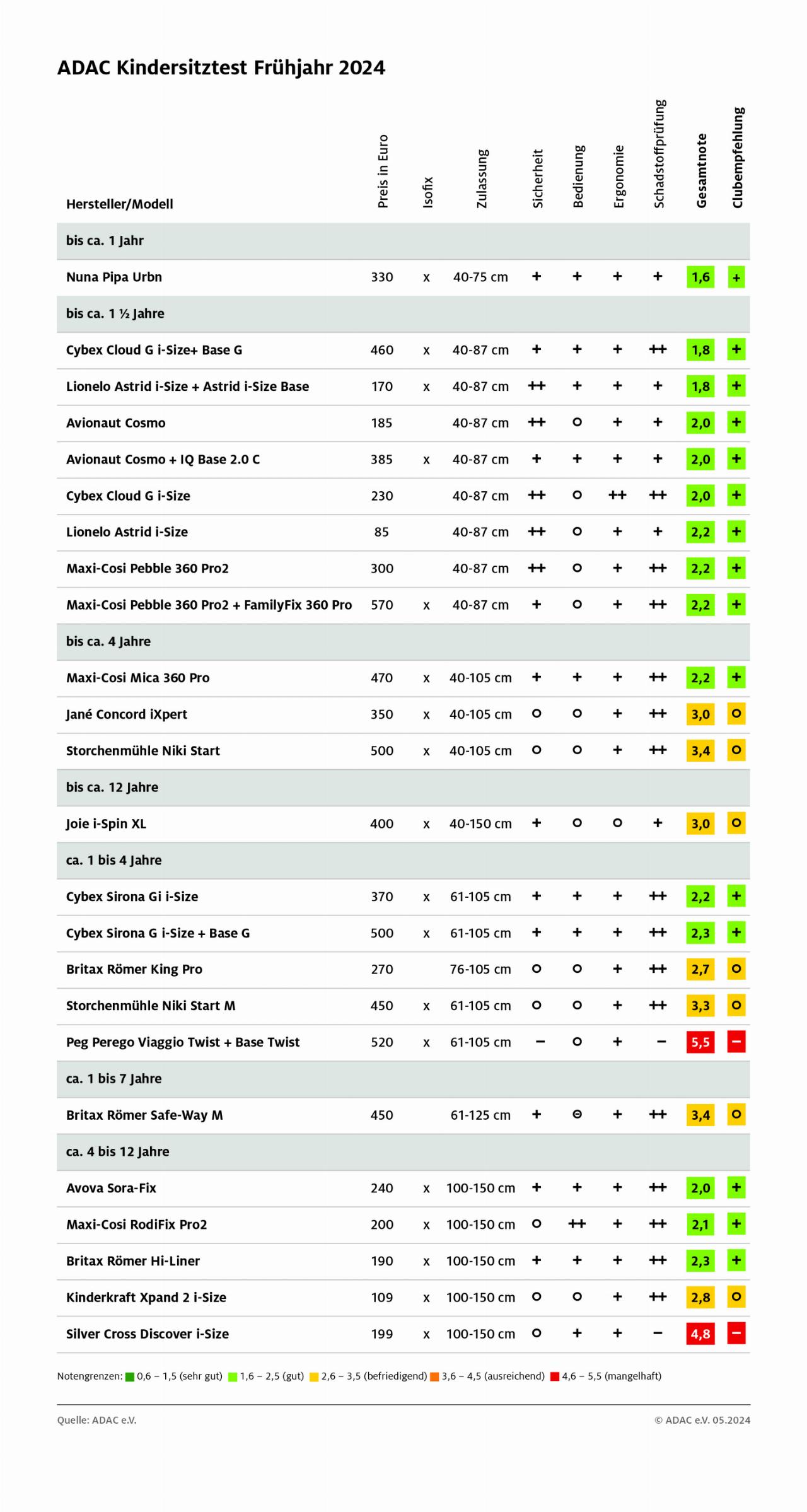 Bei den Babyschalen für die ganz Kleinen (Größe 40 bis 87 Zentimeter) gab es durchwegs gute Noten. Dabei erreichte das Modell Nuna Pipa Urbn als Spitzenreiter die Note 1,6. Bei den Kleinkindersitzen bis 105 Zentimeter schnitten der Maxi-Cosi Mica 360 Pro und der Cybex Sirona GI i-Size am besten ab (jeweils Note 2,2), und bei den Sitzen für die Großen bis 150 Zentimeter der Avova Sora-Fix (Note 2,0).