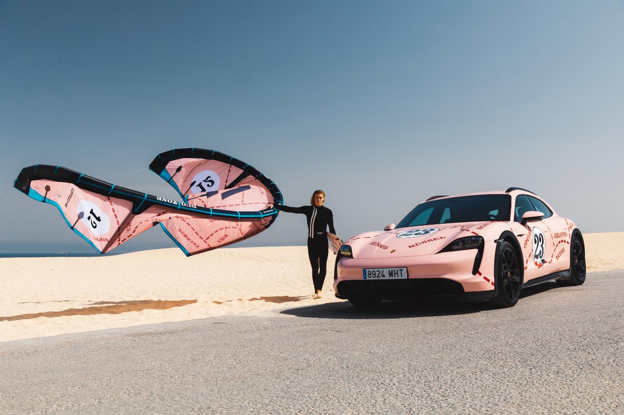 Im Farbdesign des Porsche 910/20 von 1971: Taycan 4 Cross Turismo und Kitesurf-Sonderedition von Duotone.