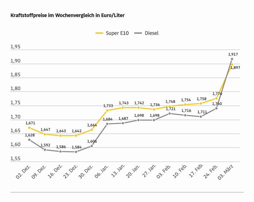 Der Krieg im Iran und in der Golfregion hat zu einem dramatischen Anstieg der Kraftstoffpreise geführt. Nach Marktbeobachtungen des ADAC kostet ein Liter Super E10 im bundesweiten Mittel 1,897 Euro. Damit hat sich Super E10 gegenüber der Vorwoche um 12,1 Cent verteuert. Bei Diesel fiel der Preissprung noch höher aus: Ein Liter verteuerte sich binnen Wochenfrist um 17,7 Cent auf im Schnitt 1,917 Euro. Die Zwei-Euro-Marke wurde zeitweilig gerissen. Ähnliche Preisaufschläge gab es zuletzt vor gut vier Jahren wegen des russischen Angriffs auf die Ukraine.
