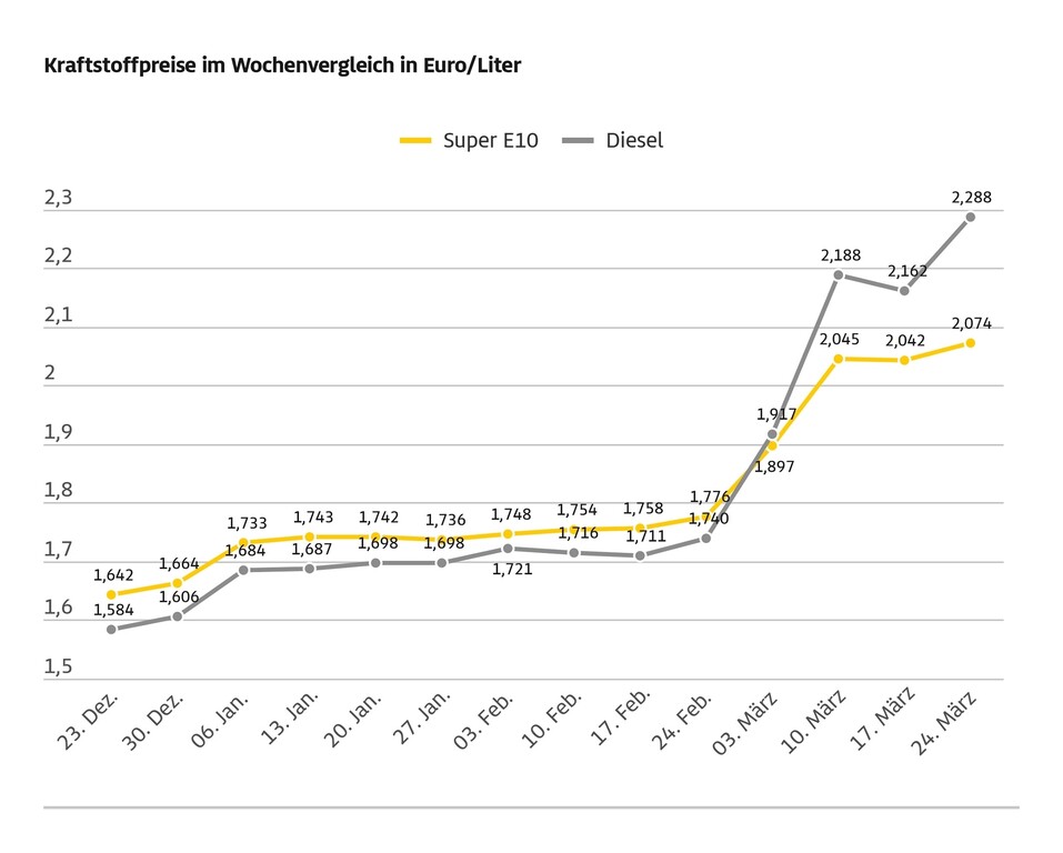 Im Laufe der vergangenen Woche erreichten die Preise beider Kraftstoffsorten ihre jeweiligen Jahreshöchststände. Super E10 kostete am vergangenen Freitag (20.3.2026) 2,086 Euro, Diesel am Montag (23.3.2026) im Schnitt 2,310 Euro. Damit lag der Dieselpreis nur noch 1,1 Cent unter dem Allzeithoch vom März 2022. Wesentlicher Auslöser für die Preissprünge war der gestiegene Ölpreis infolge des Kriegs im Iran und der Auswirkungen auf die Golfregion. Zwischenzeitlich notierte Brent-Öl deutlich über 110 US-Dollar, gestern fiel der Preis dann jedoch unter die Marke von 100 US-Dollar.