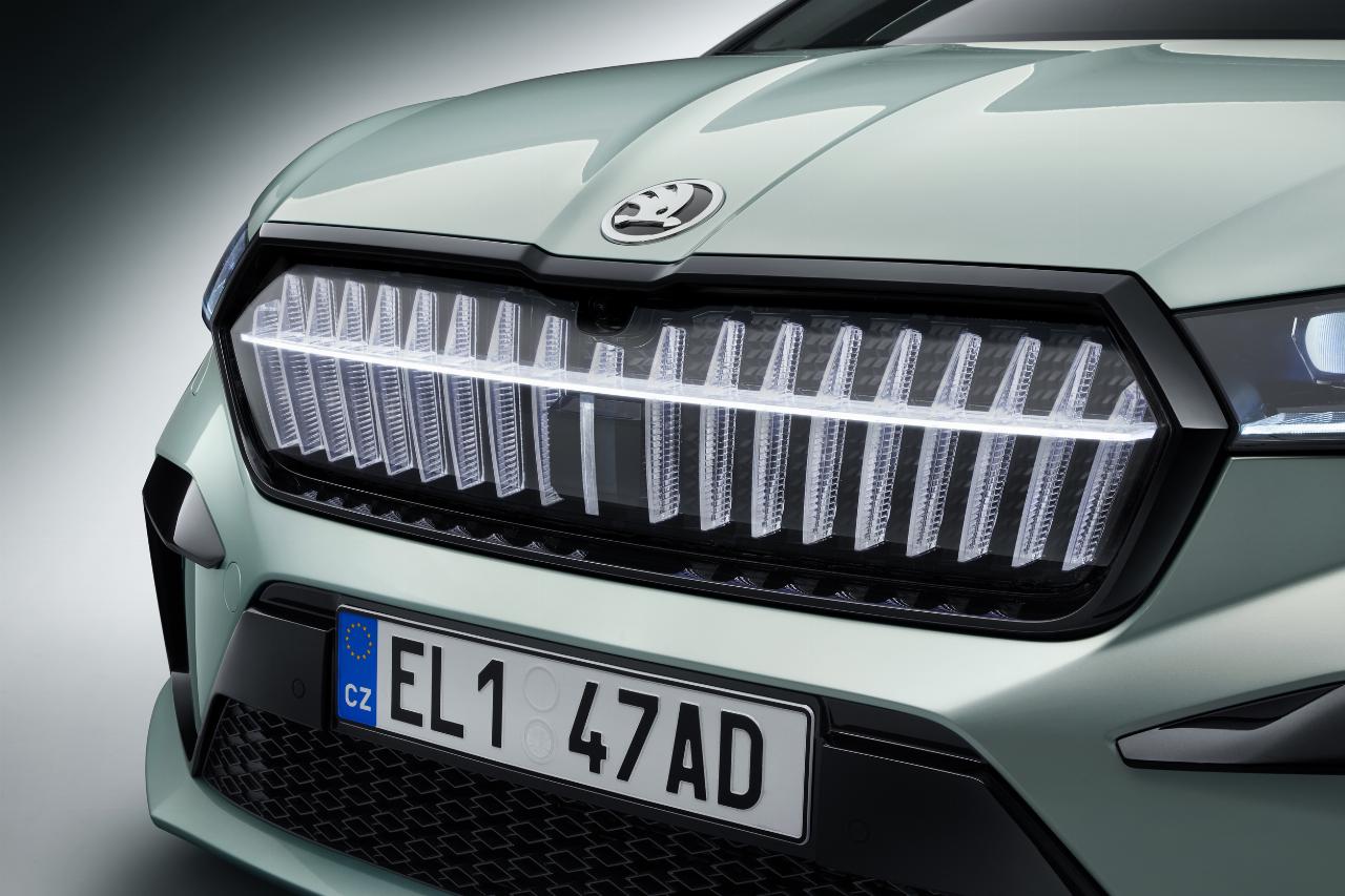Realisiert wird der illuminierte Kühlergrill durch 131 LEDs, die in einen dickwandigen Edge-Light-Lichtleiter einkoppeln und die 18 vertikalen Rippen sowie ein horizontales Band des Grills beleuchten. Während der Fahrt leuchtet das Crystal Face den Fahrbahnbereich mit aus. Beim Öffnen und Schließen des Fahrzeugs setzt es zudem Coming-Home- und Leaving-Home-Animationen um. Daneben beinhaltet das Lichtpaket für den Enyaq iV auch die Front- und Heckbeleuchtung. Je nach Ausführung beinhaltet dies ebenso anspruchsvolle Matrix-LED-Scheinwerfer wie Voll-LED-Heckleuchten, die ebenfalls dynamische Lichtfunktionen umsetzen. (aum)