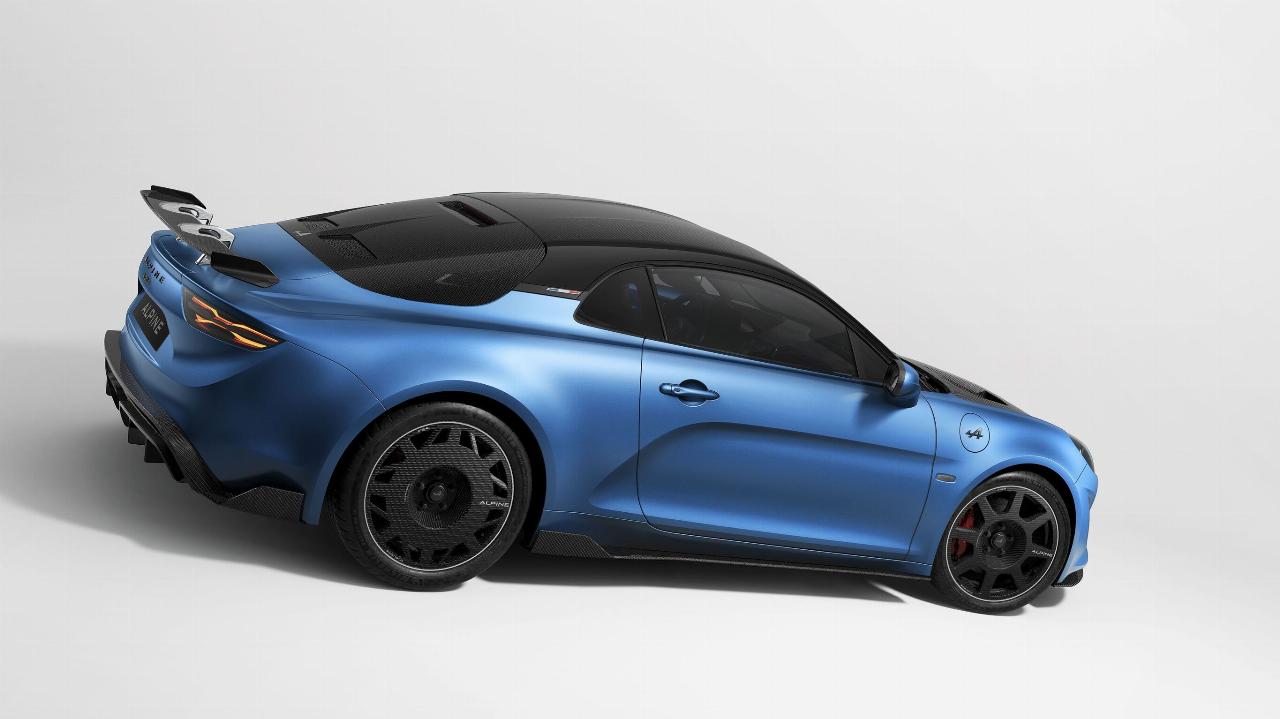 Der Heckspoiler ist an sogenannten Schwanenhals-Halterungen befestigt. Die sorgen nicht nur für eine sportliche Optik, sondern auch für eine höhere aerodynamische Effizienz, indem sie den Auftrieb an der Unterseite des Spoilers verringern. Die Form des Flügels entspricht der des Pendants bei der A110 S, jedoch ist er weiter hinten positioniert und verfügt über einen geringeren Anstellwinkel, wodurch sich der Luftwiderstand verringert. Unterm Strich ergeben sich am Fahrzeugheck so 29 Kilogramm zusätzlicher Anpressdruck bei Höchstgeschwindigkeit.