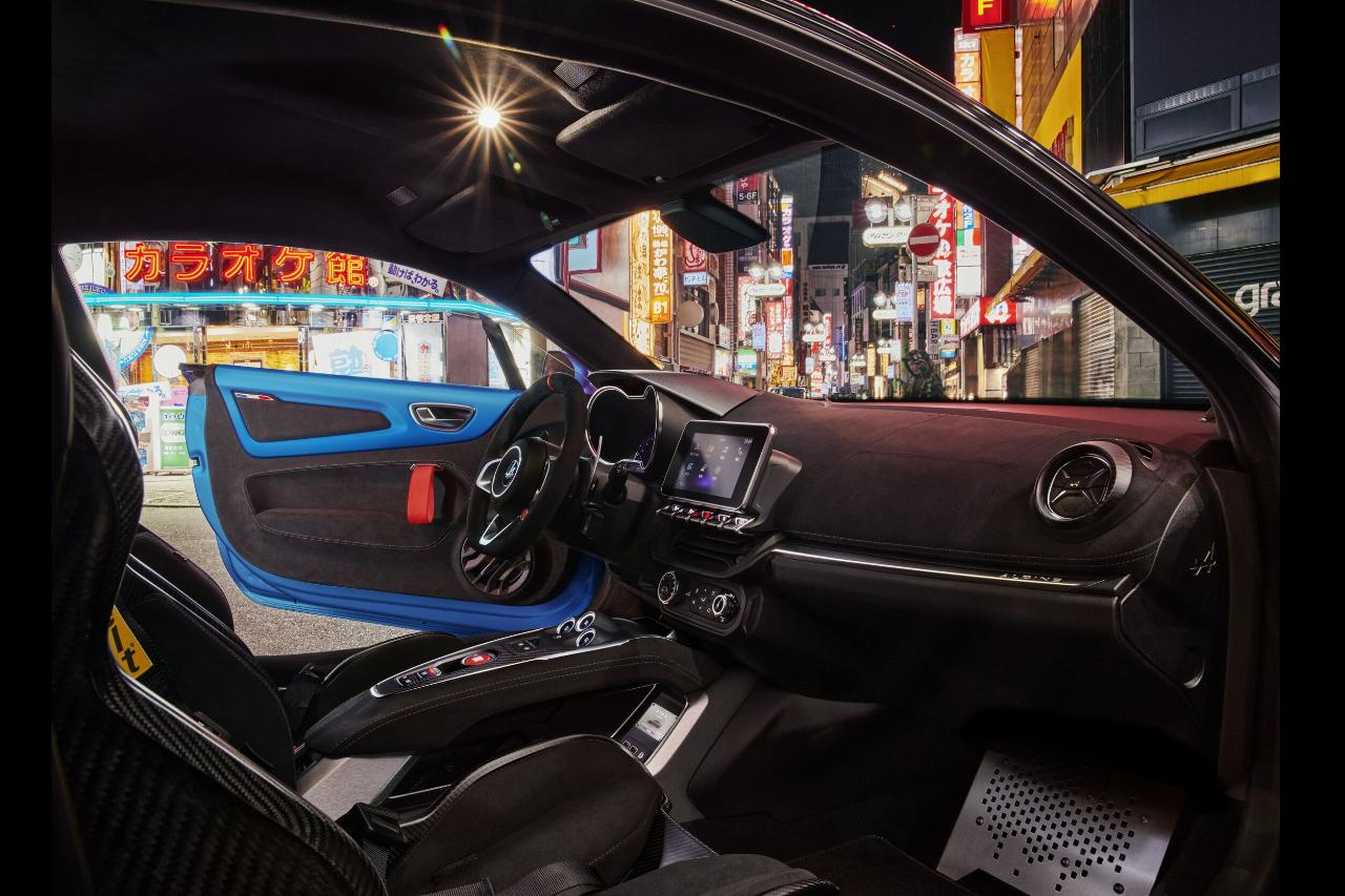 Das Interieur der Alpine A110 R inklusive Lenkrad und Sitzschalen ist komplett mit Mikrofasergewebe ausgekleidet. Anstelle der üblichen Griffe finden sich als Anleihe aus der Welt des Motorsports rote Riemen zum Schließen der Türen. Eine Plakette an der Mittelkonsole weist auf den exklusiven Charakter des Modells hin. Die Serienausstattung umfasst unter anderem das On-Board-Telemetriesystem „Alpine Telemetrics“, das Ladedruck, Getriebetemperatur, Beschleunigungswerte, Drehmoment, Leistung, Lenkwinkel und andere technische Daten in Echtzeit anzeigt. Der integrierte Chronograph lässt sich zum Messen und Aufzeichnen von Rundenzeiten auf der Rennstrecke verwenden.