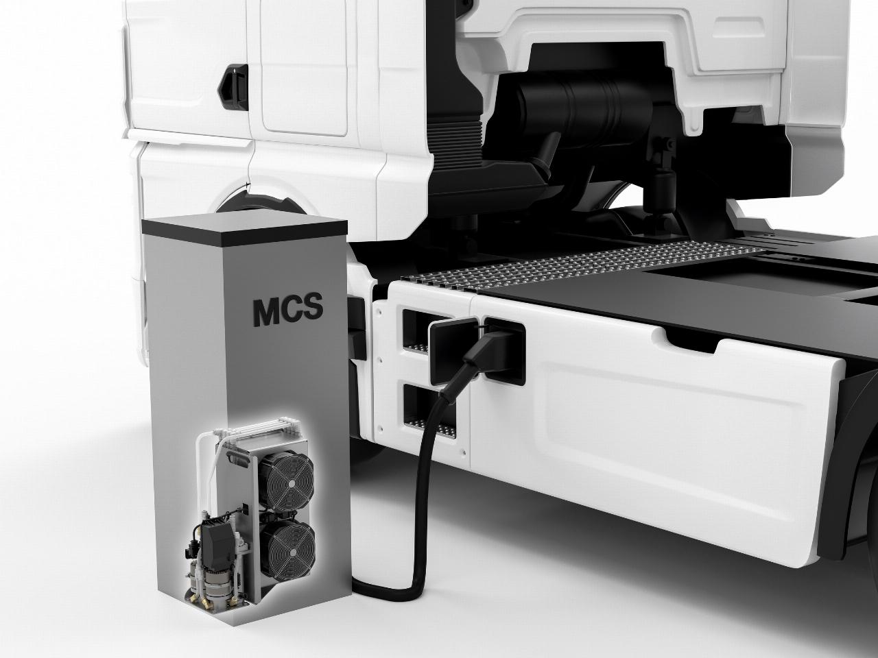 Megawatt-Charging-Systeme (MCS) für elektrische Nutzfahrzeuge finden sich hauptsächlich an Raststätten und Autohöfen. Pro Säule sind Schnellladeleistungen von bis zu 3,75 Megawatt (MW) möglich, die – je nach Außentemperatur – eine Verlustwärme von bis zu 8 Kilowatt (kW) erzeugen. „In unserem Kühlmodul schalten wir bis zu vier Wärmetauscher hintereinander, die über angesaugte Luft die Abwärme des Kabels herunterkühlen. Lüfter transportieren die Luft nach außen“, erklärte Norman Nagel, Leiter Business Development Mahle Industrial Thermal Systems. Das Modul kann an den vom Kunden vorgegebenen Bauraum verschiedener Ladesäulen angepasst werden und ist für Umgebungstemperaturen von minus 35 bis plus 50 Grad Celsius freigegeben.