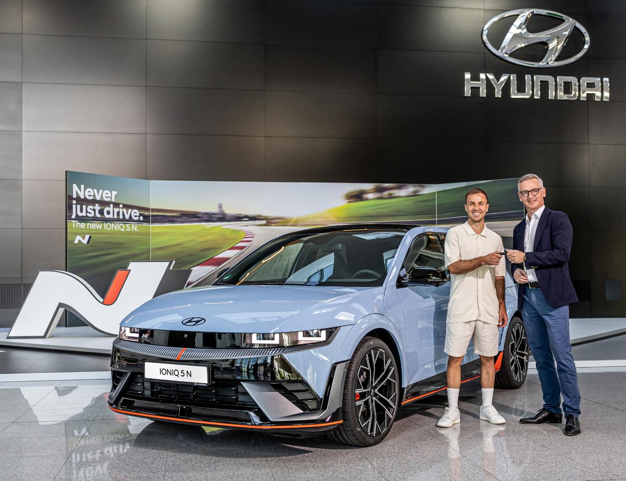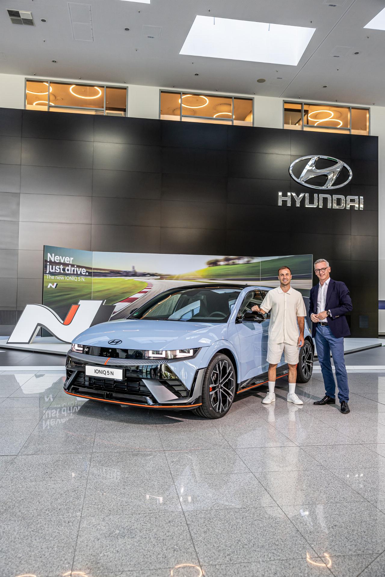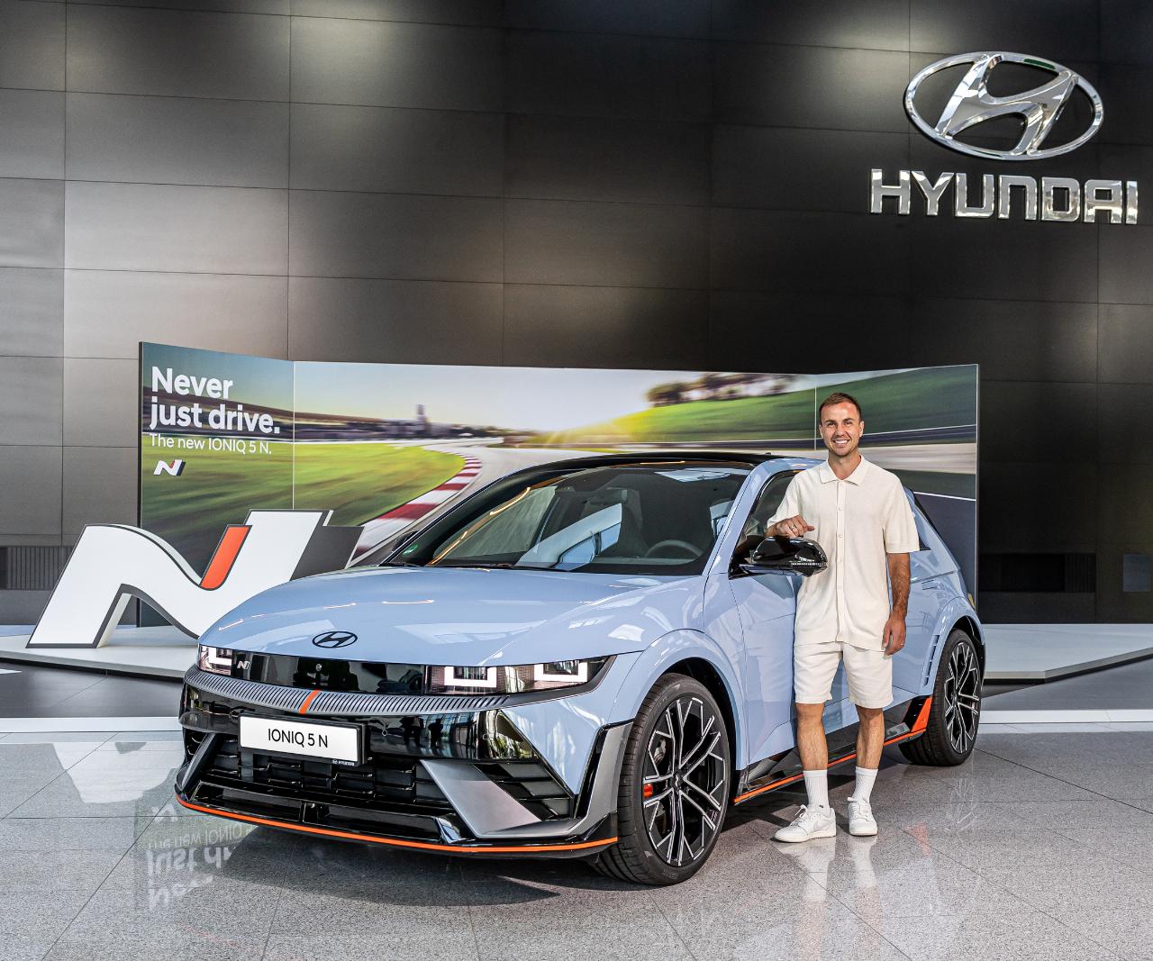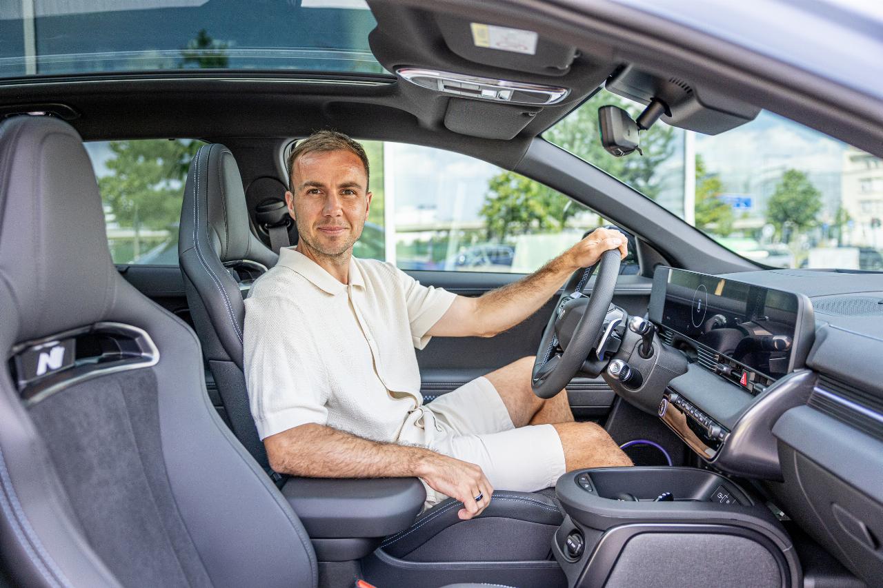 Hyundai-Markenbotschafter Mario Götze fährt künftig einen Ioniq 5 N. Bisher war der Fußball-Weltmeister von 2014 mit einem Ioniq 5 und einem Ioniq 6 unterwegs. Zwar hätten ihn auch diese beiden Modelle begeistert, aber die 650 PS (478 kW) des N seien schon etwas Besonderes, sagte Götze. „Das macht einfach Spaß.“ In dem bis zu 260 km/h schnellen Elektroauto in der Farbe Perfomance Blue verbinden sich für den Familienvater „Sportlichkeit und Alltagstauglichkeit miteinander“.