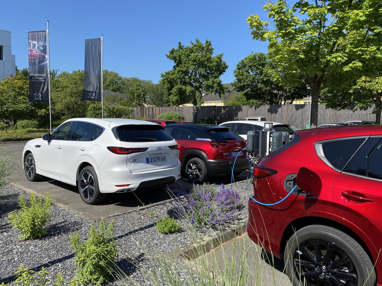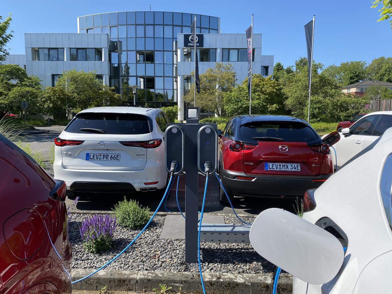 Seinen Mitarbeitern bietet Mazda in Leverkusen unter anderem spezielle Leasingkonditionen für Fahrzeuge mit alternativem Antrieb und kostenlose Lademöglichkeit an den 194 AC-Ladepunkten auf dem Firmengelände. Mittlerweile fahren bereits 52 Prozent aller Firmen- und Leasingfahrzeuge elektrisch. Bei optimalen Bedingungen können die Ladesäulen durch die neue Photovoltaikanlage vollständig mit eigenem Solarstrom versorgt werden.