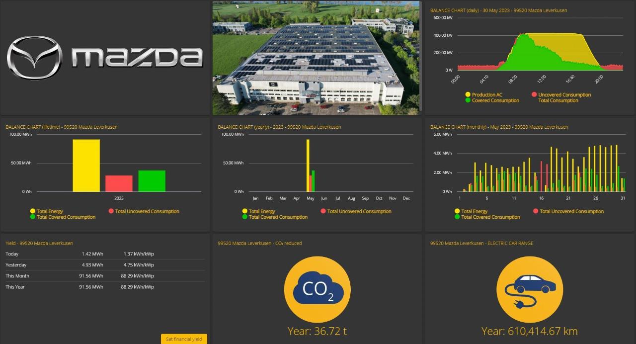 Mazda hat an seiner Deutschland- und Europazentrale die größte Photovoltaik-Anlage Leverkusens in Betrieb genommen. Die auf dem 14.000 Quadratmeter großen Dach des ehemaligen Teilelagers installierten rund 2400 Solarmodule haben einen Spitzenleistung von einem Megawatt und produzieren jährlich etwas 900.000 kWh Solarstrom. Dies entspricht dem durchschnittlichen Jahresverbrauch von 300 bis 400 Haushalten. Das Investitionsvolumen betrug über eine Million Euro.