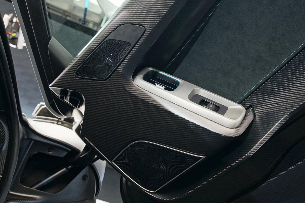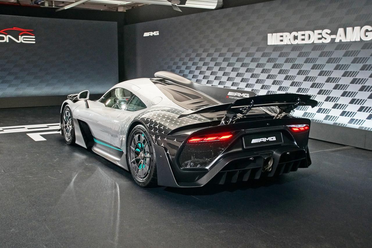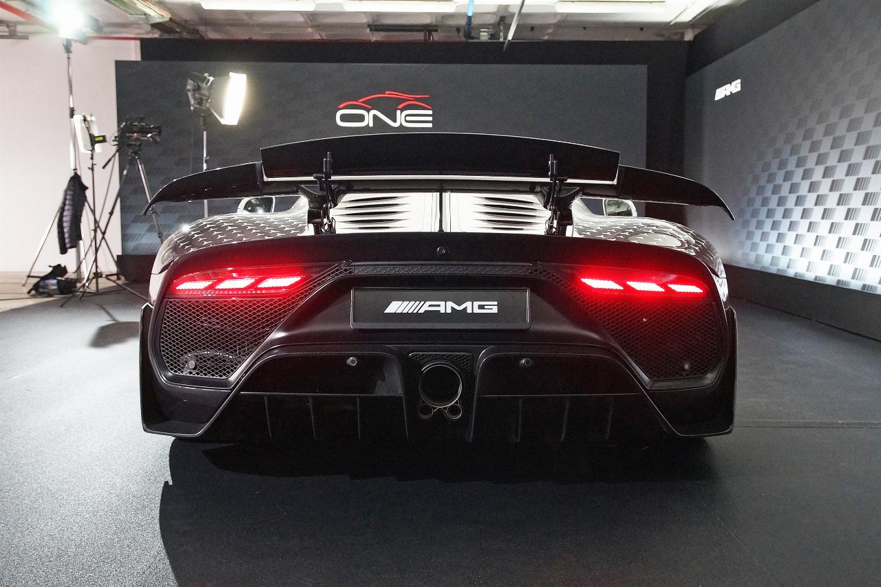 Den gleichen Ansatz verfolgt der AMG One im Heck, wo die Formel-1-Leistungseinheit sitzt – in Form eines turboaufgeladenen 1,6-Liter-V6-Ottomotors und zwei E-Motoren. Dabei ist der Verbrennungsmotor Kernelement der gesamten Heckstruktur. Verbrenner und Getriebe sind mit dem Monocoque verbunden, die Hinterachse mit fünf Lenkern pro Seite setzt direkt an das Getriebegehäuse an und ist damit Teil der Struktureinheit. Das Fahrwerk ist in der Höhe und über Dämpferstufen von innen verstellbar, nicht jedoch elektronisch geregelt.