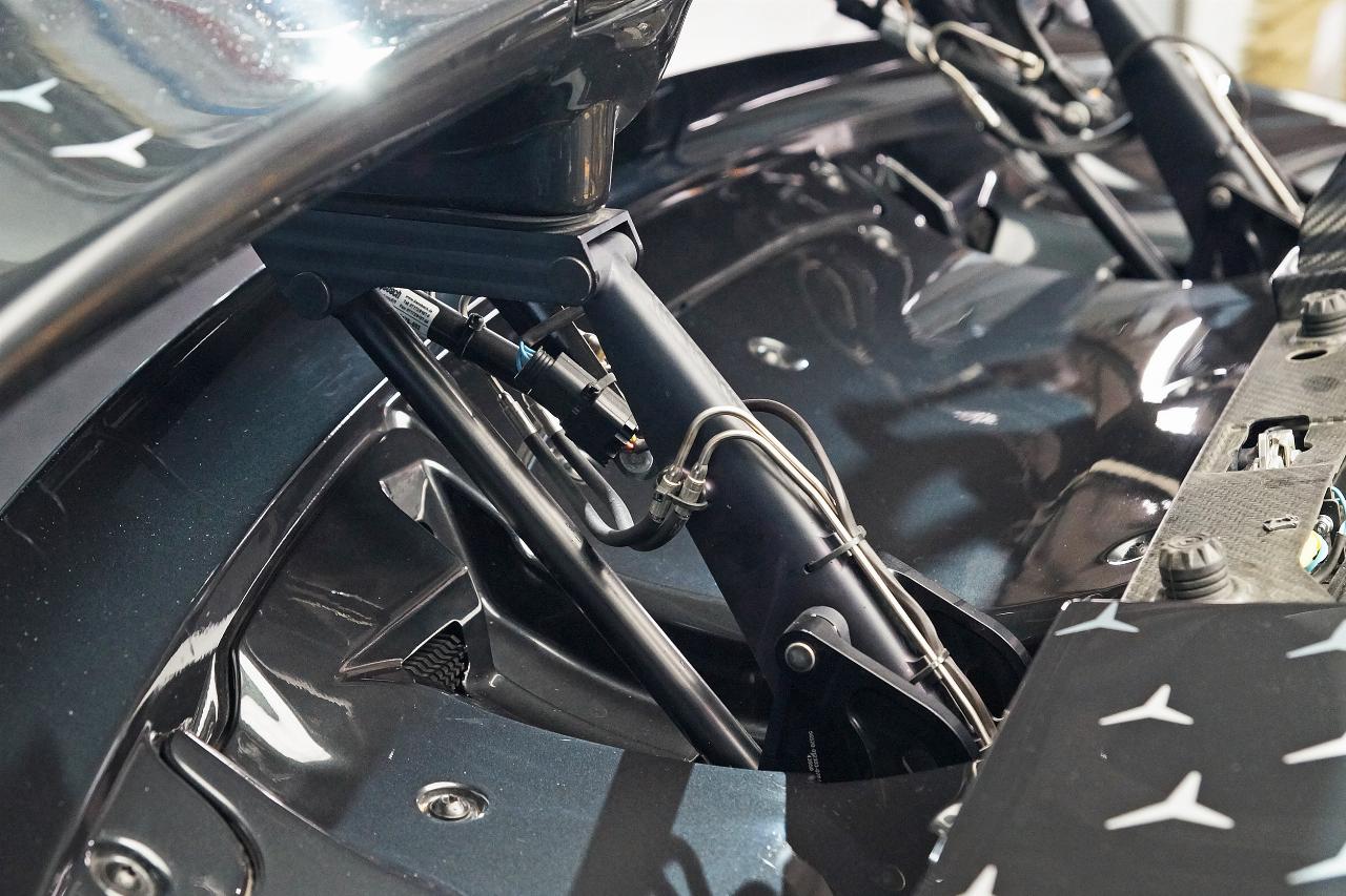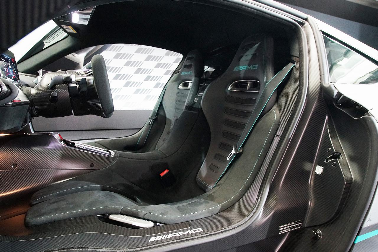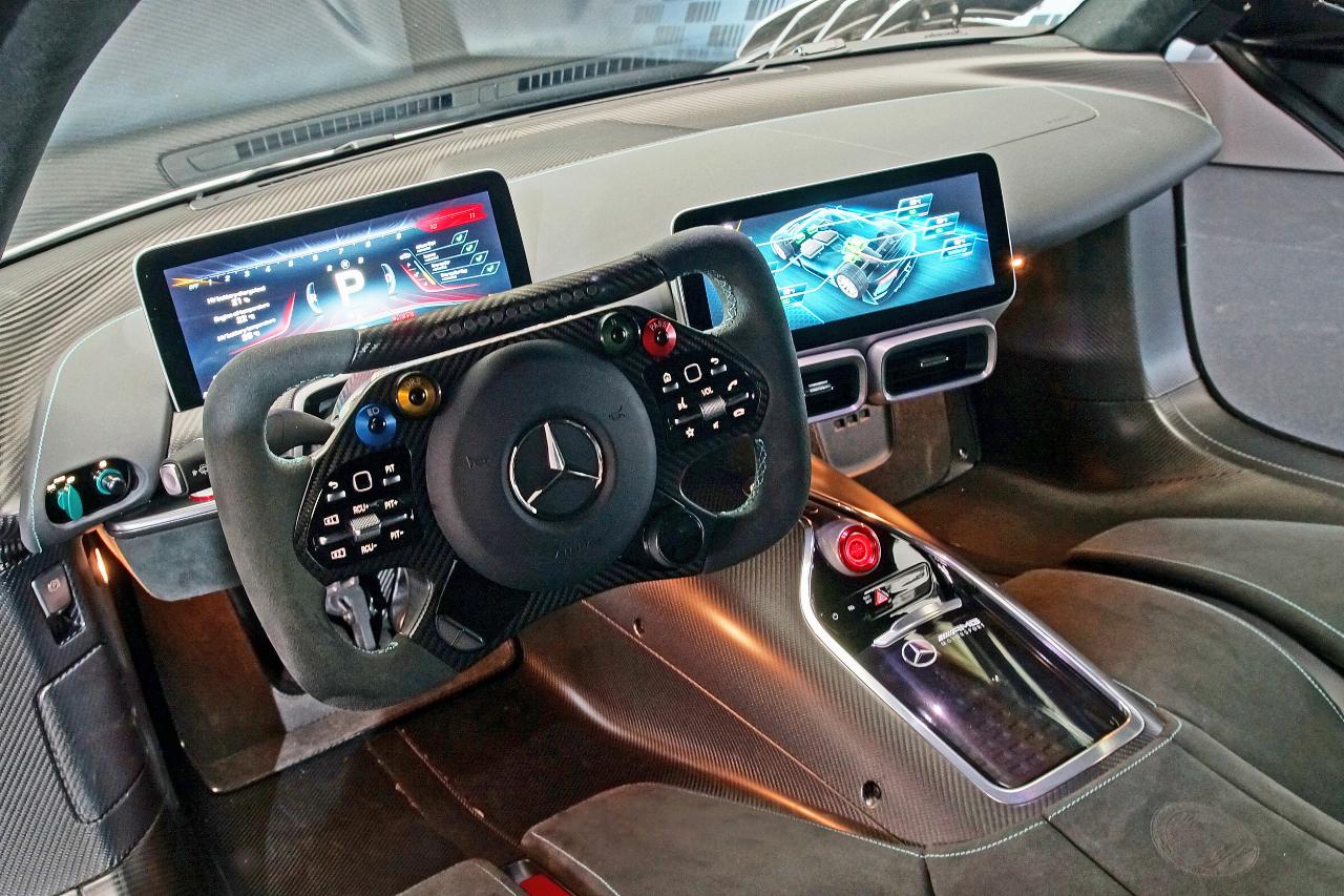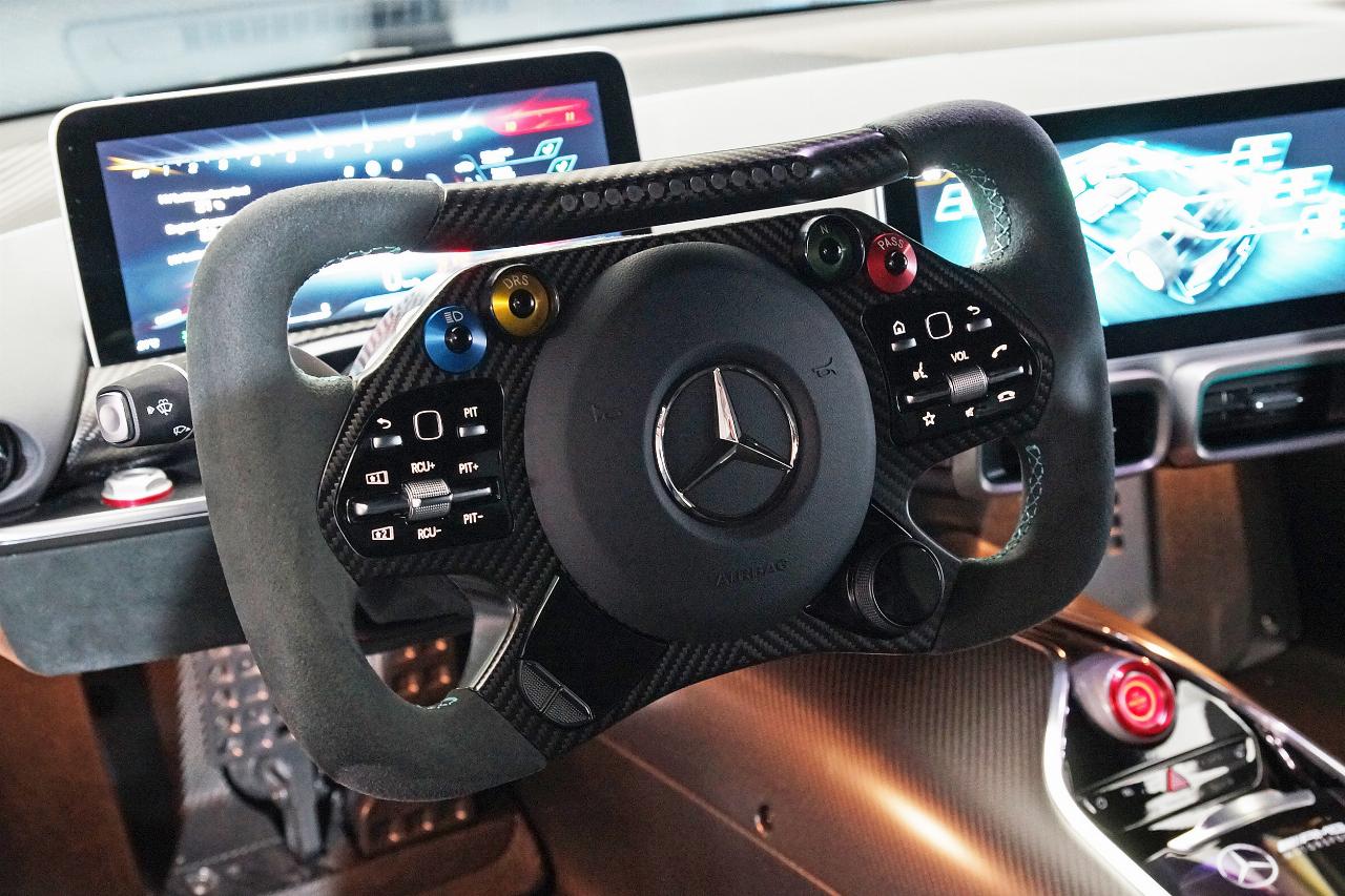 Bei der Sitzprobe wird klar: Im Monocoque ist erstaunlich viel Platz, die Fahrgastzelle ist breit und komfortabel. Der Sitz ist fest fixiert, dafür sind Lenkrad (axial und vertikal) sowie Pedalerie verstellbar. Das Volant stammt dabei direkt aus der Formel 1 und sorgt damit für echte Rennsport-Atmosphäre, ansonsten gibt es aber viel bekanntes – zum Beispiel Schalter, Navigation und Klimaanlage. Im Prinzip wurde das MBUX-System in einen Formel-Rennwagen implantiert – inklusive der duzenden „Hey-Mercedes“-Funktion. Eindeutig: Es war Ingenieursziel, den Kunden in eine vertraute Umgebung zu setzen. Weil es keine Heckscheibe gibt, wird der kamerabasierte Blick nach hinten auf den Bildschirm projiziert.