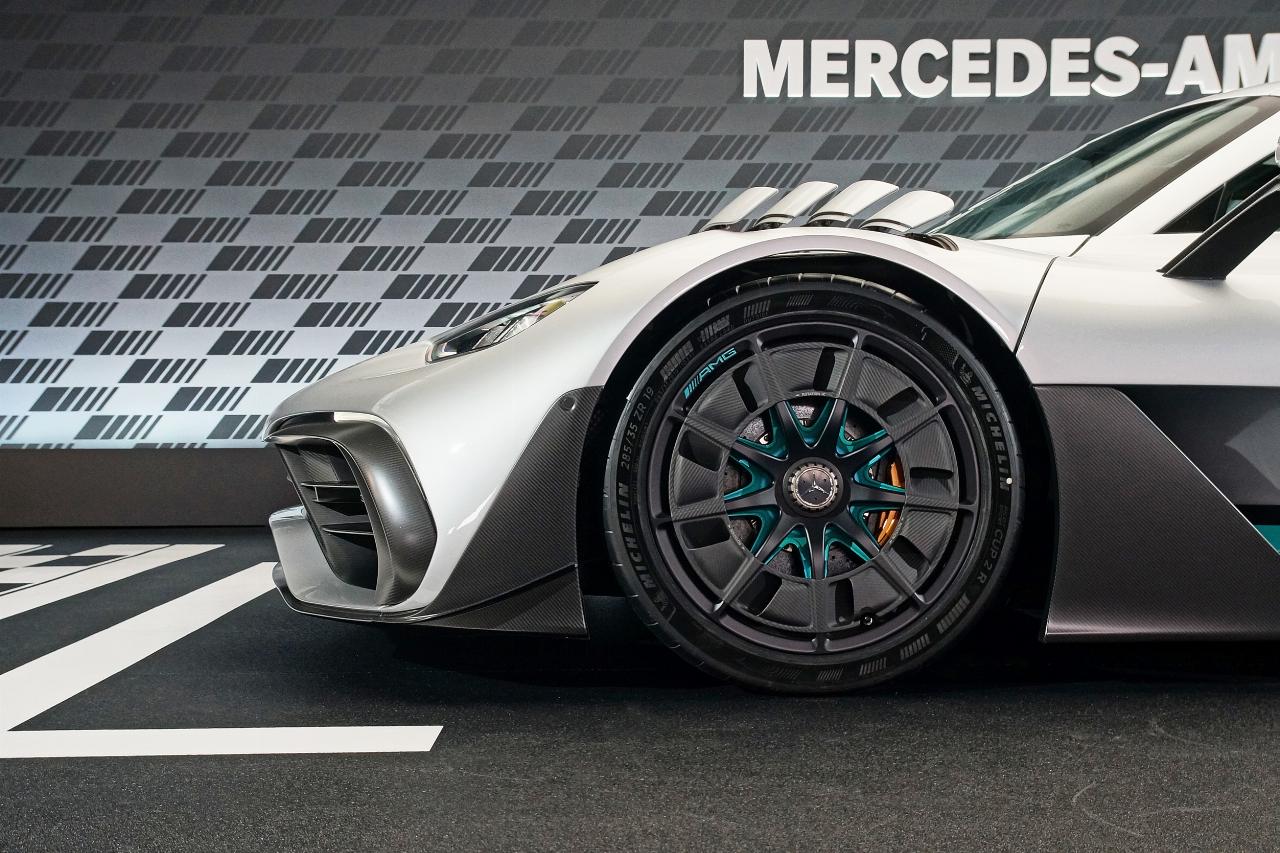 Es kommen ausschließlich Michelin-Pilot-Sport-Cup-Reifen der Dimension 285/35 ZR 19 vorn und 335/30 ZR 20 hinten zum Einsatz; für maximale Verzögerung sorgt eine Kohlefaser-Keramik-Bremsanlage mit Sechskolben-Festsätteln vorn und Vierkolben-Festsätteln hinten. Damit sind die fahrwerkseitigen Voraussetzungen geschaffen, um die brutale Leistung des AMG One sicher auf die Straße zu bringen. Übrigens sind die zwei Kraftstofftanks vertikal geformt, um die Spritversorgung bei extremer Querbeschleunigung sicherzustellen.