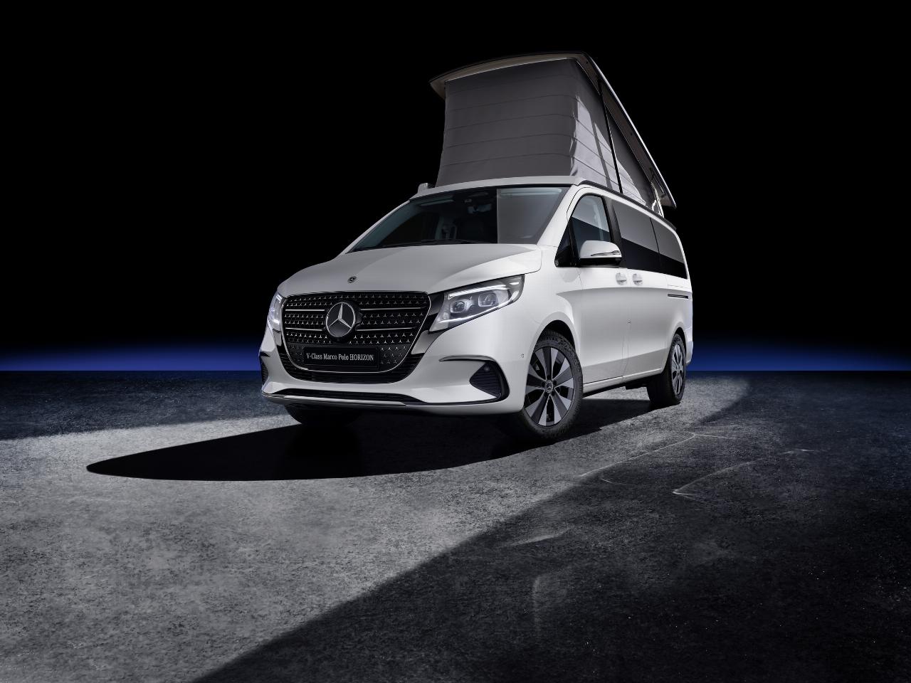 Mercedes-Benz rundet das Portfolio der in diesem Jahr überarbeiteten V-Klasse mit dem Allrounder Marco Polo Horizon ab. Das alltagstaugliche Freizeitmobil bietet ein Aufstelldach mit zwei Schlafplätzen sowie eine zur Liegefläche umklappbare Dreier-Sitzbank mit zwei darunter liegenden Schubladen. Serienmäßig gibt es zwei Schiebetüren und zwei drehbare Vordersitze. Als Extras können unter anderem Klapptisch, ein Außenstromanschluss und eine Standheizung bestellt werden. Die Preisliste für den Mercedes-Benz Marco Polo Horizon beginnt bei 58.940 Euro. (aum)