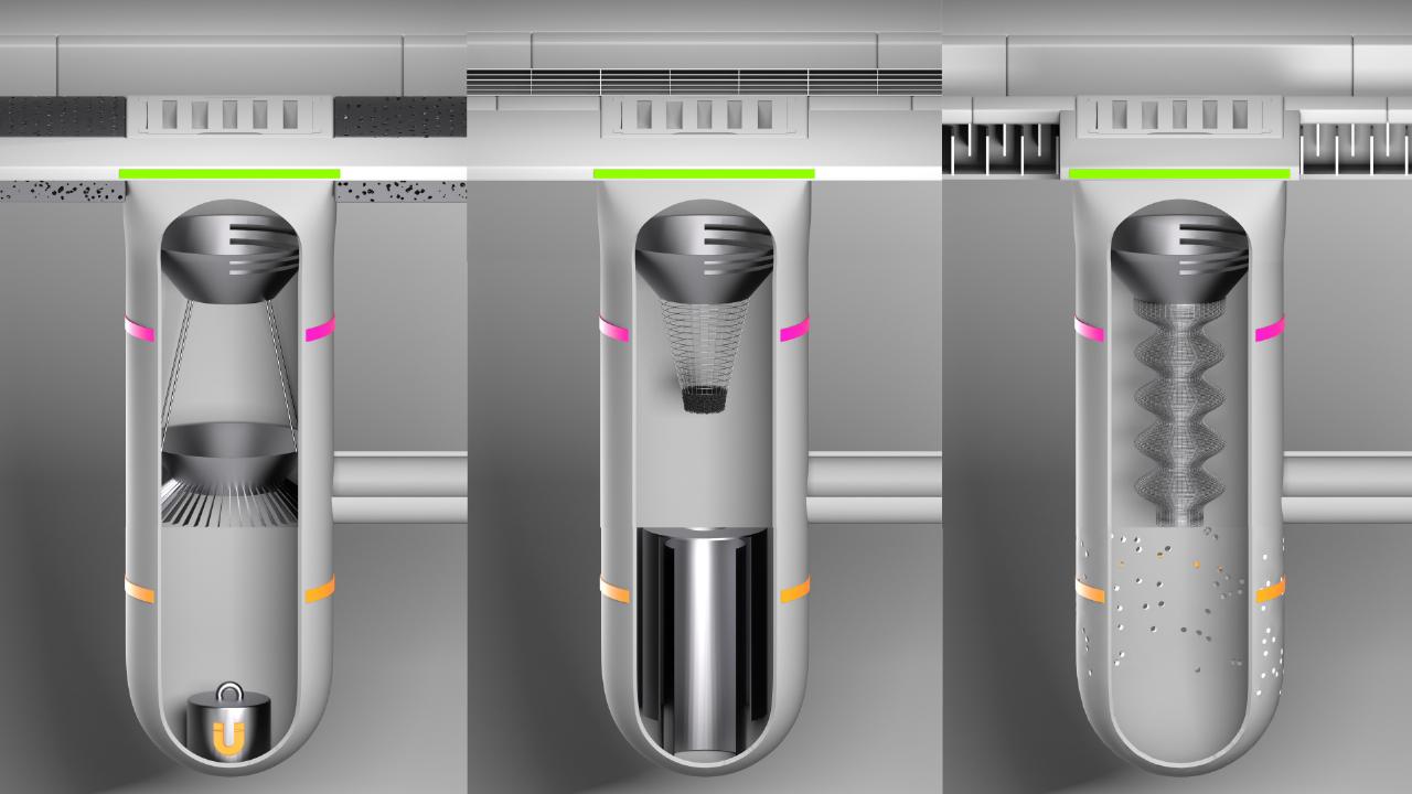 Die Sedimentfilter sind in die drei Zonen Straße, Schacht und Ablauf unterteilt und bestehen aus neun Modulen. Bis zu drei Module können miteinander kombiniert werden, um je nach Einsatzort das beste Ergebnis zu erzielen. Im obersten Straßenbereich kann das eine spezielle Ablaufrinne sein. Darunter, im Gullischacht selbst, werden Feststoffe beispielsweise mit Hilfe eines optimierten Laubkorbs oder eines sogenannten Filterrocks grob herausgefiltert. Im untersten Bereich, dem Ablauf, geht es um die Feinfiltration, wofür ein Magnetmodul zum Einsatz kommen kann.