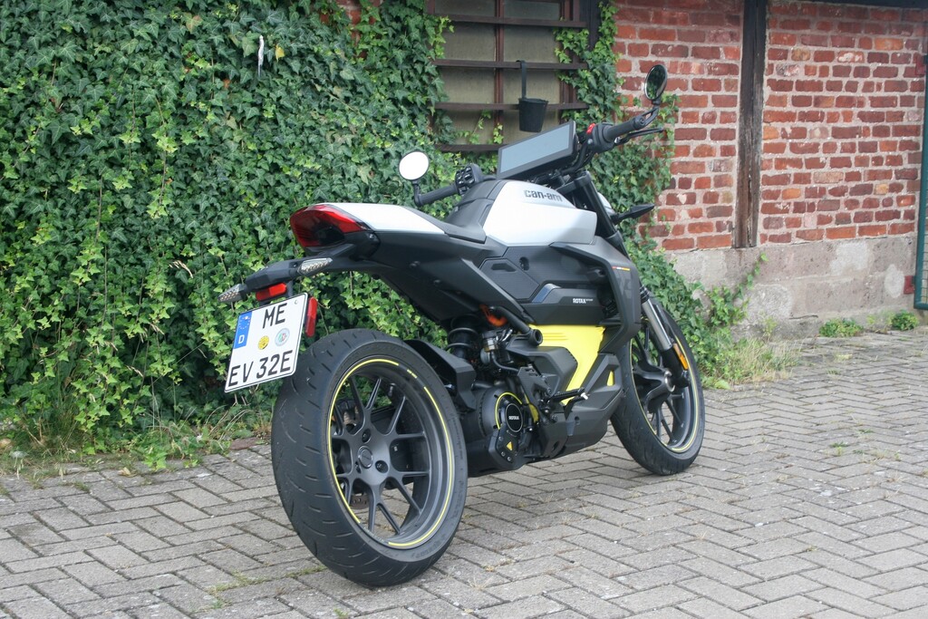 Vehement beschleunigt die Can-Am Pulse unter optimalen Bedingungen in 3,8 Sekunden von 0 auf 100 km/h. Bei 127 km/h setzt die Leistungselektronik weiterem Vortrieb zugunsten des Energieverbrauchs ein Ende. Ohnehin ist der Akku mit einer Kapazität von 8,9 kWh recht knapp bemessen. Das reicht für eine Normreichweite von 130 Kilometern (bei der Origin sind es noch einmal 15 Kilometer weniger). Immerhin erweist sich diese Angabe in der Praxis nicht als Fantasiewert. Und Can-Am sieht die Pulse ohnehin am liebsten in der Hand „smarter Pendler und urbaner Entdecker“ (O-Ton). Immerhin ist die Batterie in gut zwei Stunden wieder voll.