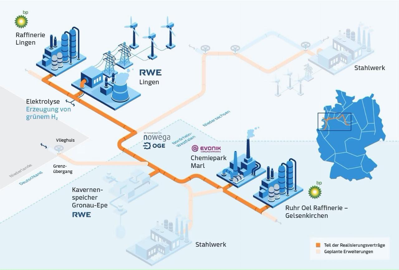 Auf der Strecke von Lingen über den Chemiepark von Evonik in Marl nach Gelsenkirchen sollen bestehende Leitungen des heutigen Erdgasnetzes von Nowega und OGE sowie bestehende Leitungen von Evonik auf den Transport von Wasserstoff umgestellt werden. Für die Anbindung von Erzeugern und Abnehmern werden darüber hinaus kürzere Leitungsabschnitte neu gebaut. In den BP-Raffinerien in Gelsenkirchen und Lingen sowie im Chemiepark Marl soll grüner Wasserstoff im Produktionsprozess sowie als Rohstoff eingesetzt werden, als Ersatz für den „grauen“ Wasserstoff, bei dessen Erzeugung CO2-Emissionen anfallen. Für die chemische Industrie dient Wasserstoff nicht nur als Energiequelle, sondern ist als Rohstoff für zahlreiche Produkte wichtig.