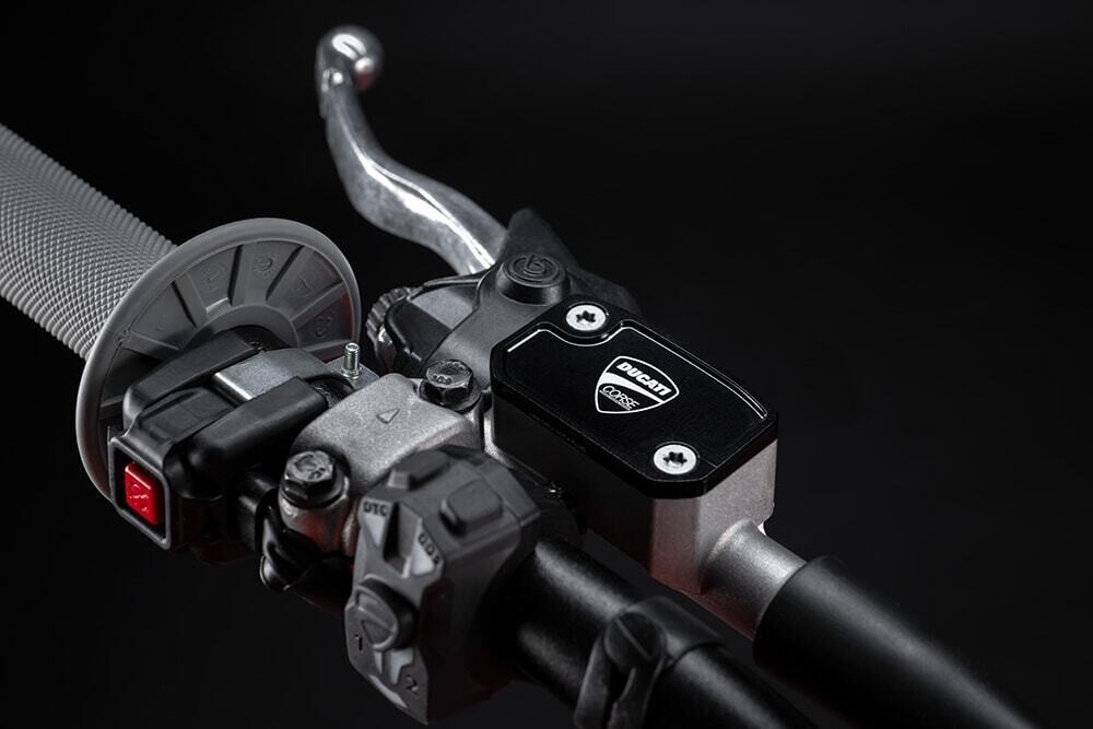 Ducati hat auch einen Kunststoff-Motorschutz , Kühlerabdeckungen gegen Schlamm und Sand, sowie spezielle Abdeckungen für die vordere Bremsscheibe und den Luftfilter im Programm. Funktionale Designelemente wie CNC-gefräste, schwarz eloxierte Deckel für Brems- und Kupplungsflüssigkeitsbehälter, den Tankdeckel und den Öleinfüllstutzen gehören ebenso zum Angebot wie ein leichter Kunststoff-Motorradständer und eine Matte, beide mit Ducati-Corse-Logo und in den typischen Farben, für Garage oder Box.