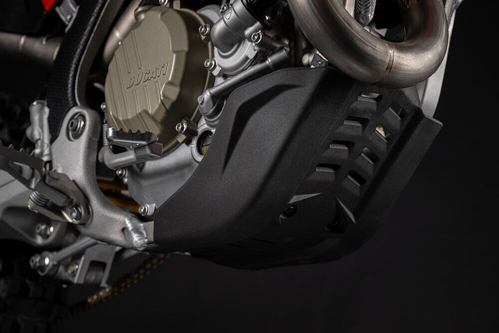 Darüber hinaus können in Echtzeit Motordrehzahl, Gasstellung, Luft- und Kühlmitteltemperatur, Luftdruck und Fehlermeldungen angezeigt werden. Auch Betriebsstunden, Ölwechsel- und Serviceintervalle lassen sich abrufen. Ein spezieller Bereich der App empfiehlt zudem die optimalen Fahrwerkseinstellungen – je nach Strecke, Fahrergewicht und Erfahrungslevel. Für das Setup bietet Ducati zudem Federn für die Gabel und das Federbein mit abweichenden Federraten zur Anpassung an das Fahrergewicht an. Außerdem gibt es verschiedene Übersetzungen für die Endantriebe. Ebenfalls erhältlich sind ein aus der Motocross-WM abgeleiteter Rennsitz mit speziellem Bezugsmaterial, ein Fatbar-Lenker und Griffe mit Aramid-Fasern, beide zu kombinieren mit dem neuen Gasgriffrohr.