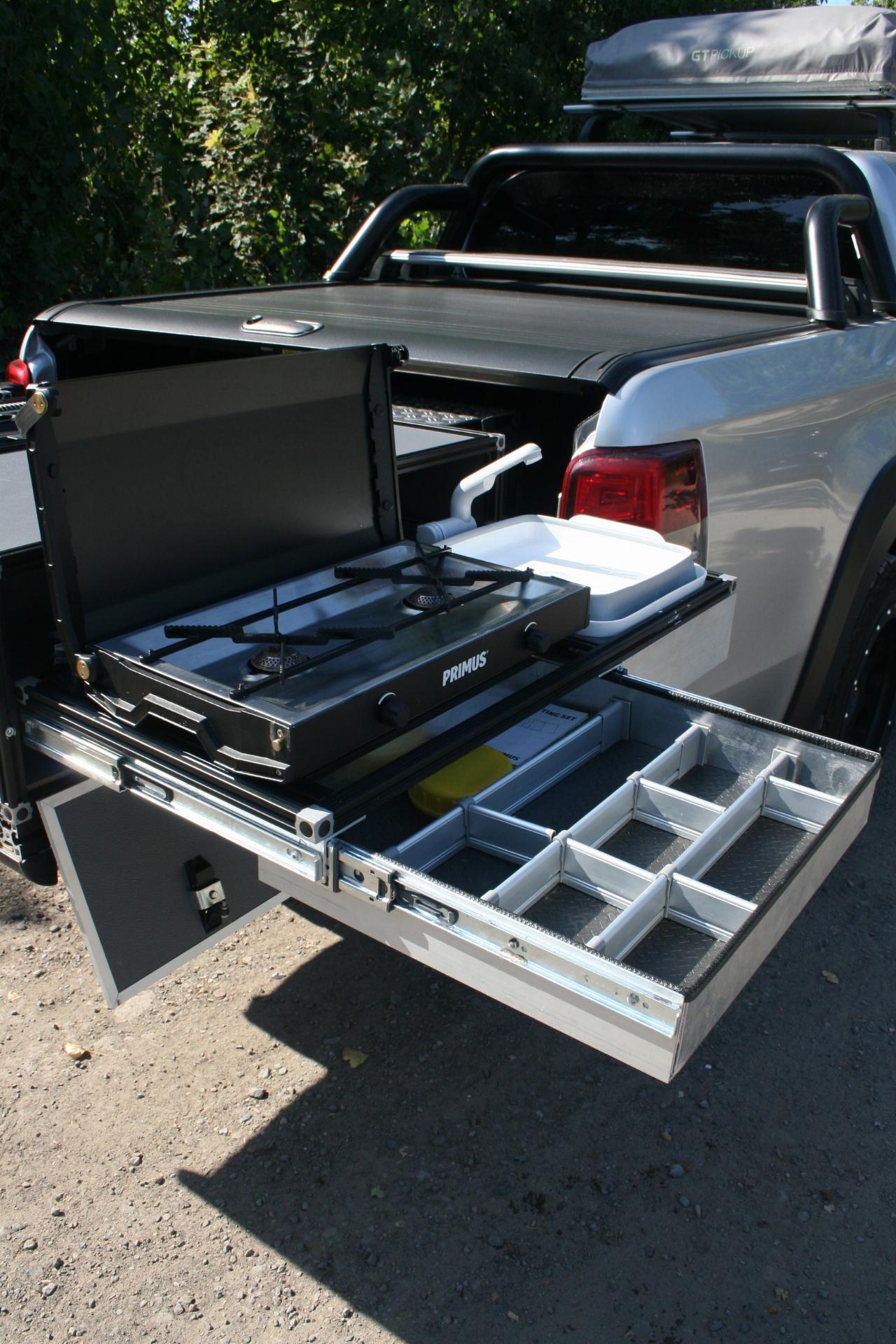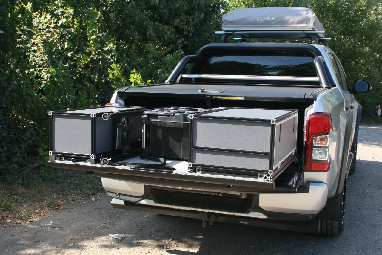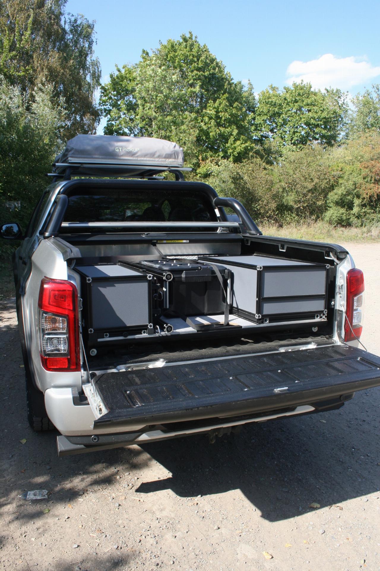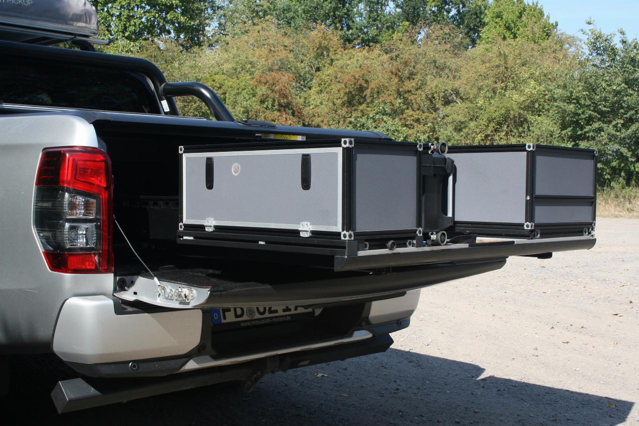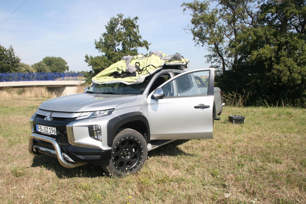 Als Schlafgelegenheit steht das aufblasbare Dachzelt GT Pick Up des österreichischen Anbieters Gentle Tent bereit, und für die Pritsche gibt es einen ausziehbaren Einschub, der sich mit einem Küchenmodul bestücken lässt. Das bringt unter anderem einen zweiflammigen Gaskocher, zwölf Liter Wasservorrat, einen großen Besteckkasten und eine Spüle sowie Staufächer mit. Zusätzliches Outdoor-Equipment findet dann auf den optionalen Querträgern über dem Laderaumrollo Platz. Wer zu zweit auf Reisen geht, der findet zudem auf der hinteren Sitzbank des Mitsubishi noch Möglichkeiten, weiteres Reisegepäck unterzubringen.