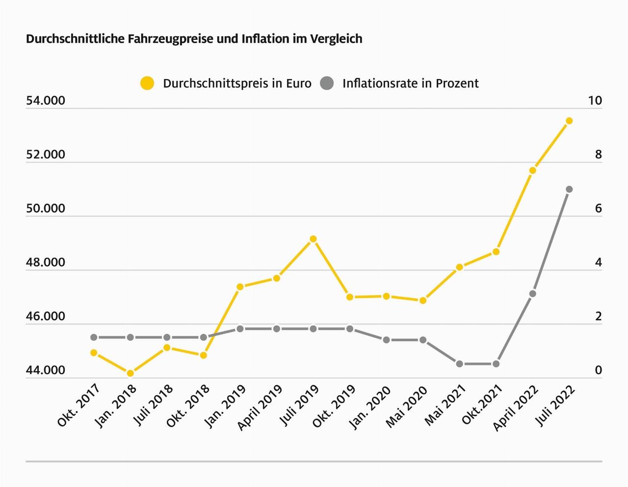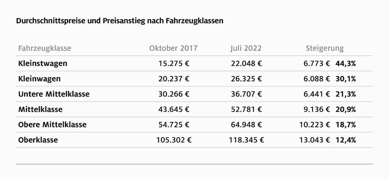 Die Durchschnittspreise aller angebotenen Modelle stiegen von 44.908 Euro im Jahr 2017 auf 53.525 Euro im Juli 2022. Das entspricht einer Erhöhung von 19 Prozent. Dagegen lag die Inflation im gleichen Zeitraum bei nur rund acht Prozent. Bei den Kleinstwagen stiegen die Neuwagenpreise im Schnitt um 44 Prozent, bei Kleinwagen um rund 30 Prozent und bei der unteren Mittelklasse um rund 21 Prozent. Ein Grund dafür könnte nach Einschätzung des ADAC nicht nur in der allgemeinen Teuerungsrate, sondern möglicherweise auch in der Einführung neuer Mindeststandards bei der Sicherheitsausstattung liegen. Dies wirke sich vor allem auf kleinere Fahrzeuge aus, während Assistenzsysteme in den höheren Klassen meist vorher schon Serie waren. Damit kann jedoch nach Ansicht des ADAC aber beispielsweise nicht der Preisanstieg ab der Mittelklasse aufwärts gerechtfertigt werden. Zudem nennen die Hersteller Lieferschwierigkeiten, den Halbleitermangel und gestiegene Einkaufspreise als Ursache.